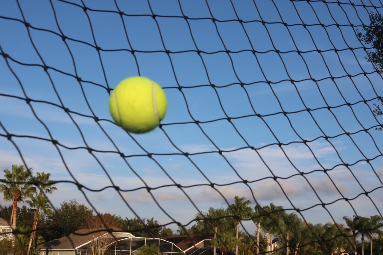 Superior barrier net for baseball , softball , tennis ball , football , featuring rope border for reinforcement , clips at each corners , 10 pieces bungee balls for neatly enclosure and easier attachment. order are made and cut in the USA.