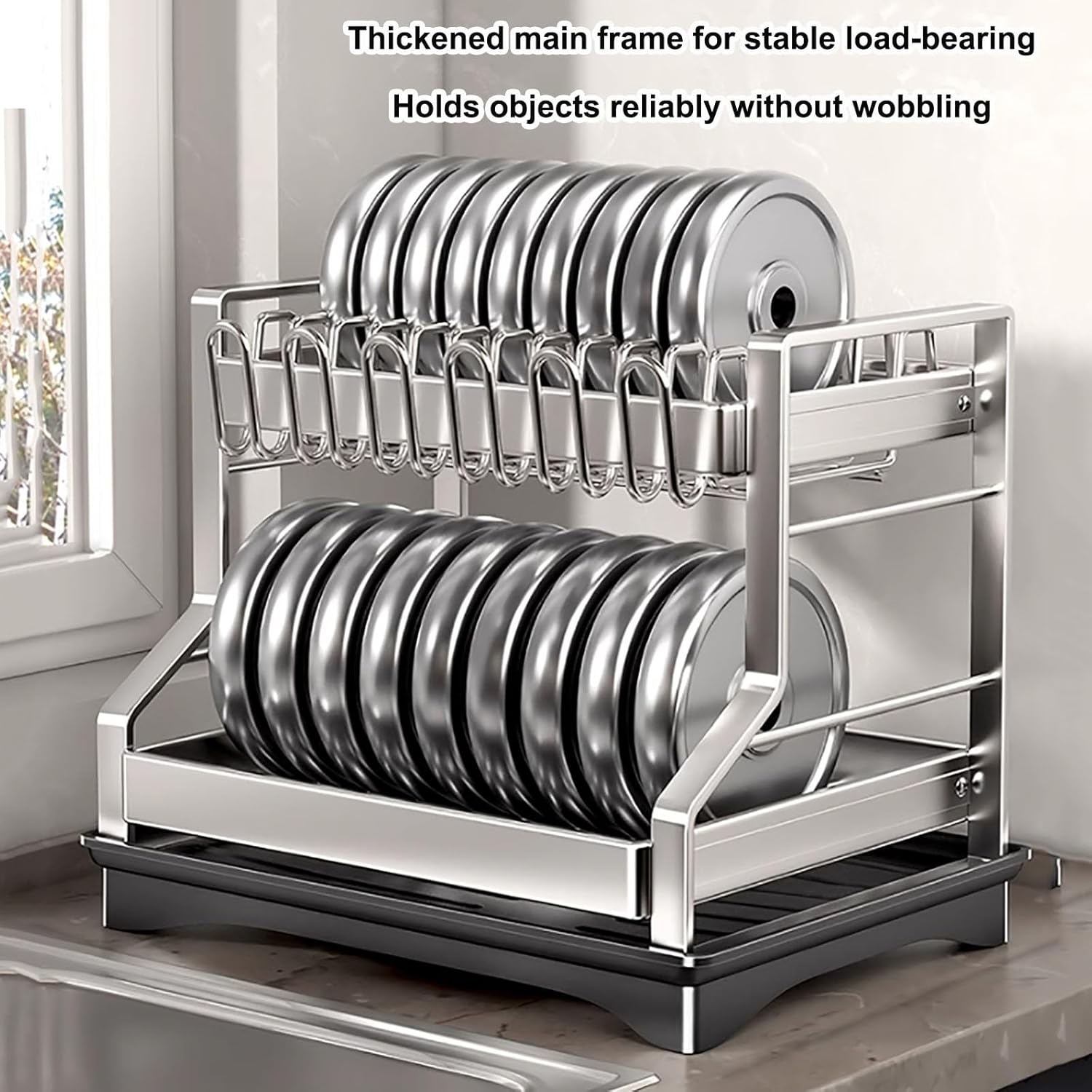 Product DescriptionTired of cluttered counters and disorganized dishware? The kitchen drying rack is the solution you need to neatly organize and store kitchenware while optimizing counter space.2-Tier design free up 30% of the counter space and create a neat and clean kitchen. The top layer of dish drying rack can store plates and cups, the bottom layer can store bowls or pots, the side cutlery rack can hold various utensils, and the other side can keep cutting boardskitchen dish holder rust resistant materials,anti-slip feet to remain firmly in place on your countertop even when fully loaded.This dish holder can be installed easily within minutes by hand, no screws, nails or any tools required. Size : 16.6 * 12.8 * 13.3 inchPackage Included: 1 x Dish draining rack ,Other items are not includedNotice:1.Due to lighting issues, there may be slight color differences in the image. Please understand, thank you2.Due to manual measurement, please allow for a difference of 1-3 centimeters. Thank you for your understanding