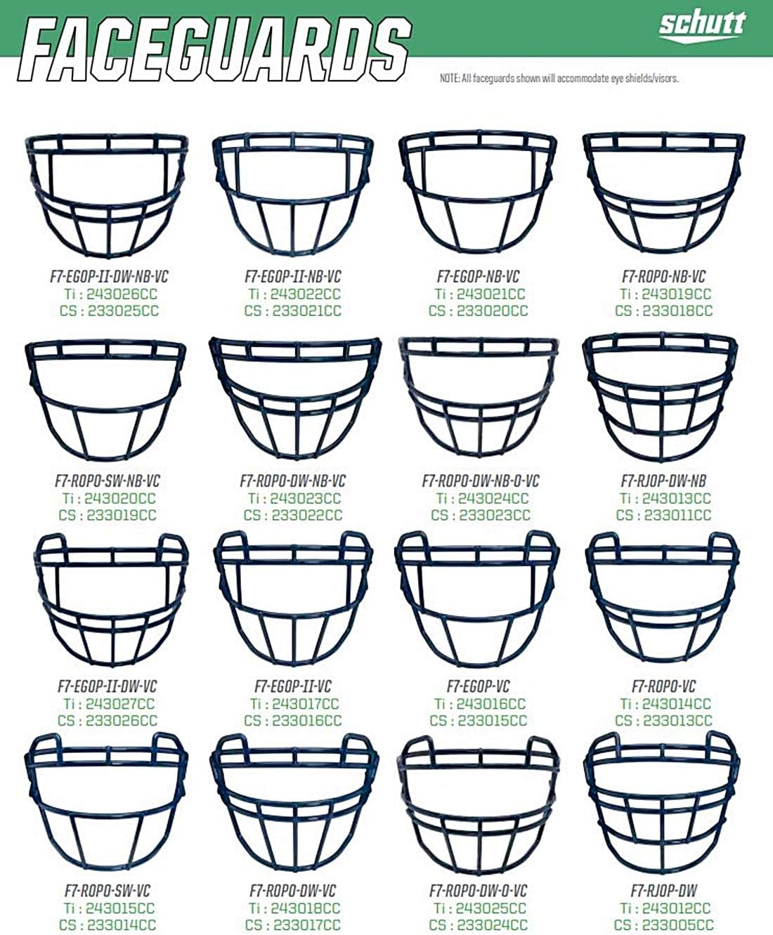 The F7 features a completely new line of titanium faceguards. The Raised Brow design deflects impacts away from the helmet. The tapered faceguard design increases range of motion and decreases the areas of potential impact. Fits the Schutt F7 VTD (S-2XL). Football's most popular faceguard material. Designed to accomodate all major brands of eye shields/visors.
