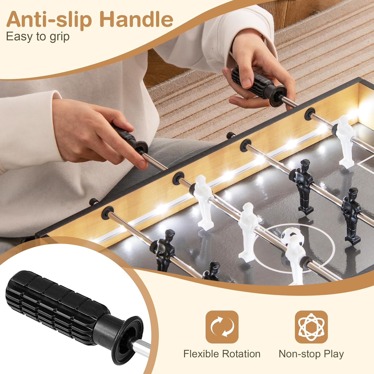 Description: Elevate your game nights with this 20-inch table foosball table! This football game table integrates dazzling LED lights to illuminate play, making each match more exciting. Featuring realistically designed players, 2 balls and anti-slip handles, the foosball table ensures enjoyable and controlled gameplay for everyone. The compact and lightweight design makes it suitable for varying spaces, such as the living room, play room, party, office and more. This foosball table serves as an inviting centerpiece for gatherings, creating memories and fostering friendly competition among kids and adults alike. Invite your friends and family to join in the fun! Features: Bright LED light strip on 2 sides for enhanced ambiance Ideal for parties, gathering, home, office and more Compact size allows for easy storage when not in use Includes 2 balls and 12 realistic players Goal box and manual scorer complete the set Non-slip handles make it easy to grip Smooth metal rods for flexible rotation Non-stop play, great for 2 players Specifications: Color: Natural Material: Plastic, MDF, Metal Product Dimensions: 24.5" x 20" x 12"(L x W x H) Net Weight: 3.5 lbs Package Includes: 1 x Foosball Table 2 x Football 12 x Football Player 1 x User Guide