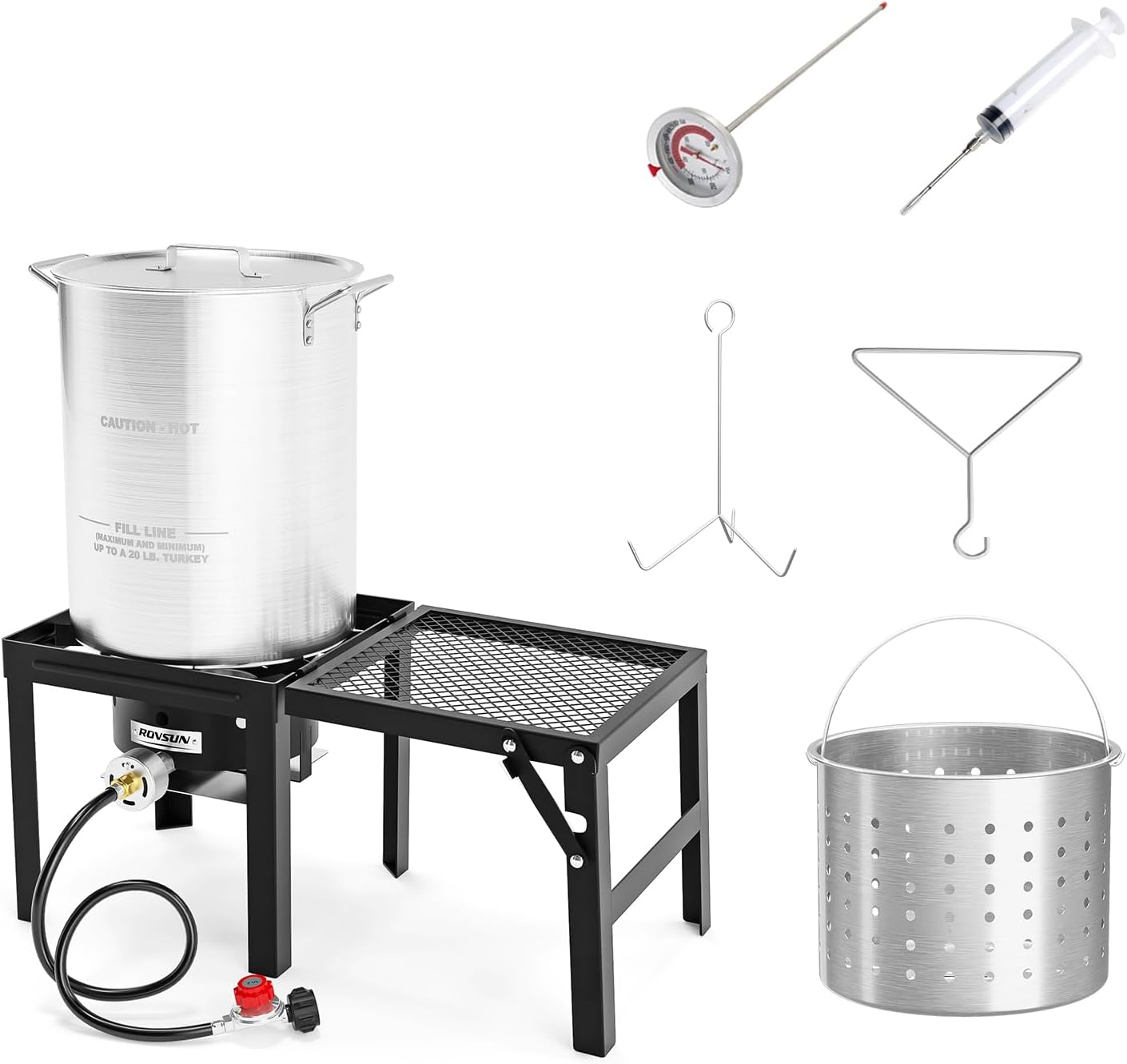 | Included Components | 2 baskets, propane stove with regulator, Thermometer, Marinade Injector, Turkey Rack & Rack Lifter, fish fryer pot, turkey fryer pot |