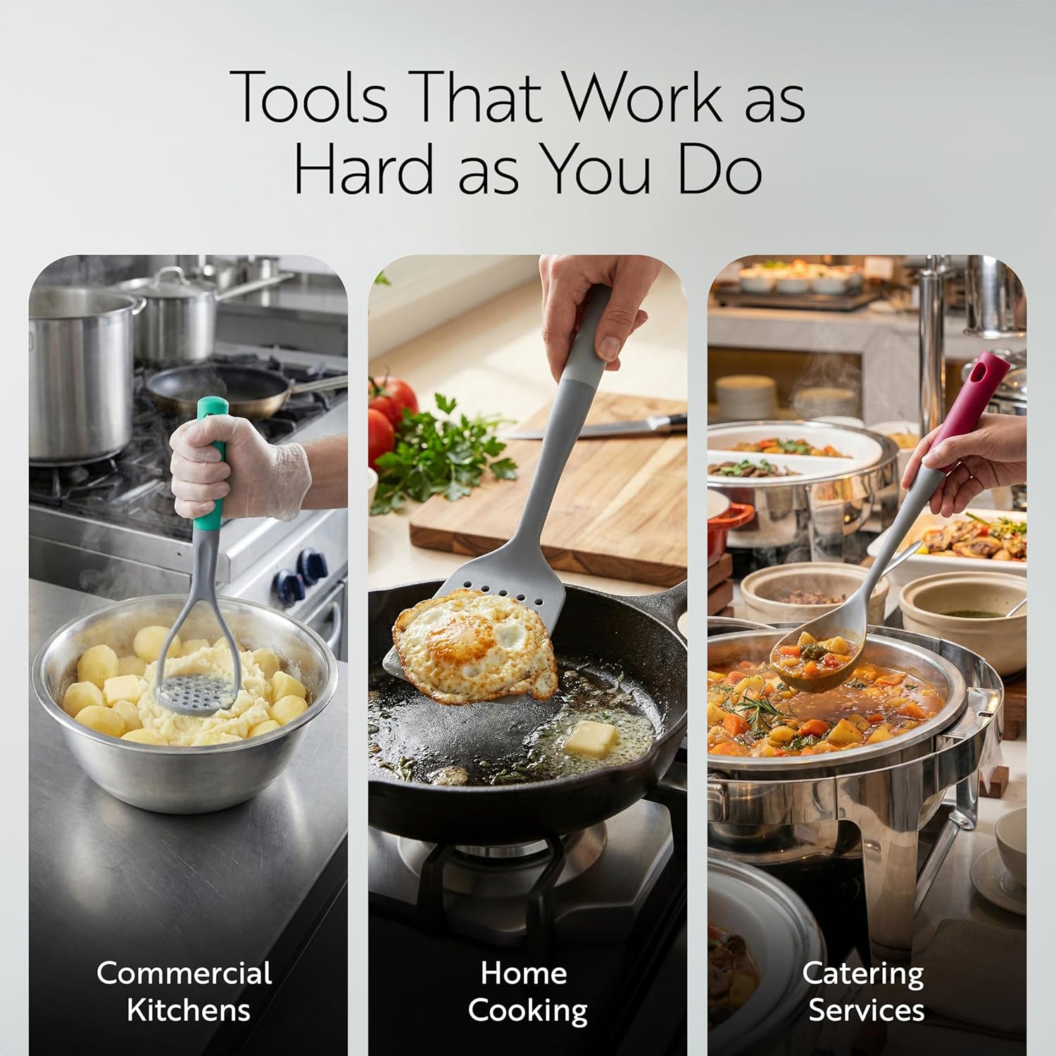 Upgrade your kitchen tools with our Met Lux Gray and Assorted Nylon High Heat Cooking Utensil Set. The flexible nylon head of these cooking utensils is perfect for use with no-stick cookware, avoiding scratches while enduring high heat up to 356F. The silicone handle of these no-slip kitchen utensils ensure a comfortable grip while preparing your favorite dishes. Designed to handle the demands of any professional kitchen, these dishwashable cooking utensils make cleanup a breeze. With assorted handle colors, this 6-piece cooking utensil set includes a ladle, turner, slotted turner, spoon, slotted spoon, and potato masher, providing versatility for all your culinary needs. These kitchen tools measure 14.8 inches in length, 3.7 inches in width, and 7.5 inches in height, making them an ideal addition to any professional kitchen. Sold in a 10 count box.
