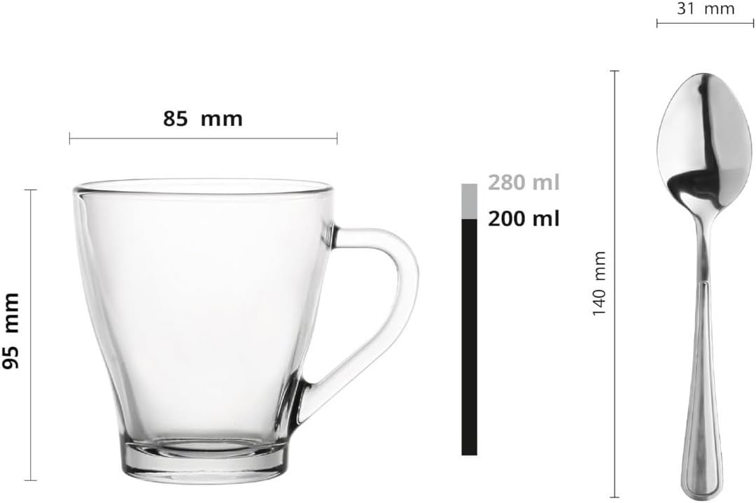 A good start to the day Start every morning in style with our elegant set of 6 coffee glasses with handle and spoon. Our glasses, made from high quality glass, are perfect for serving latte macchiato, cappuccino and tea. Thanks to their transparent structure, the drinks look particularly appetizing and show all layers and colours. Functionality and style Our ergonomic glass cups with handles provide comfort in use, and the attached spoons add a practical touch. The exceptional heat resistance makes them suitable for hot and cold drinks. Ideal for any office or home, these coffee glasses bring a touch of class to your everyday life. Practical for everyday use. The tea glasses and spoons are dishwasher and microwave safe, making them extremely practical. Save time and enjoy your favourite drinks without complications. Start your day with a cup of coffee or tea, served in our elegant set.