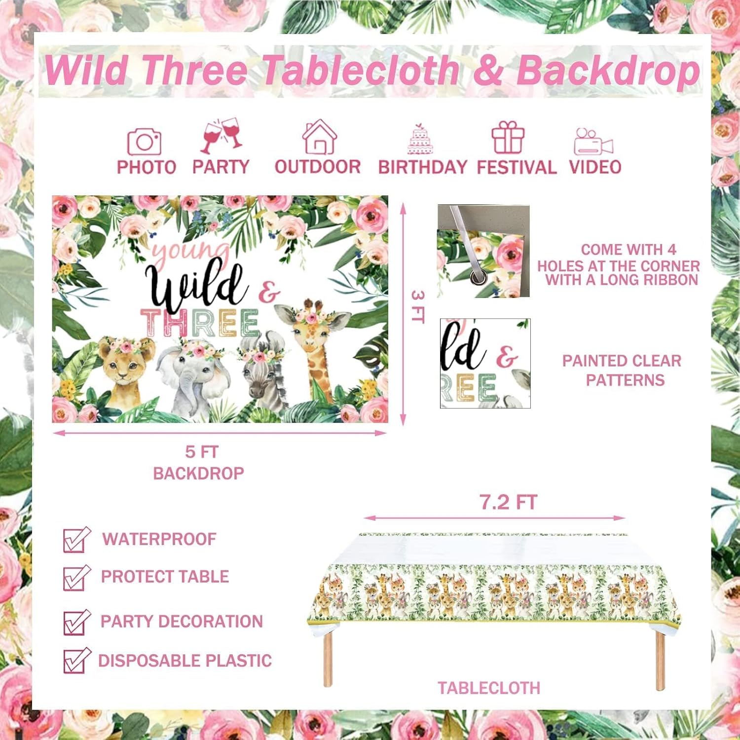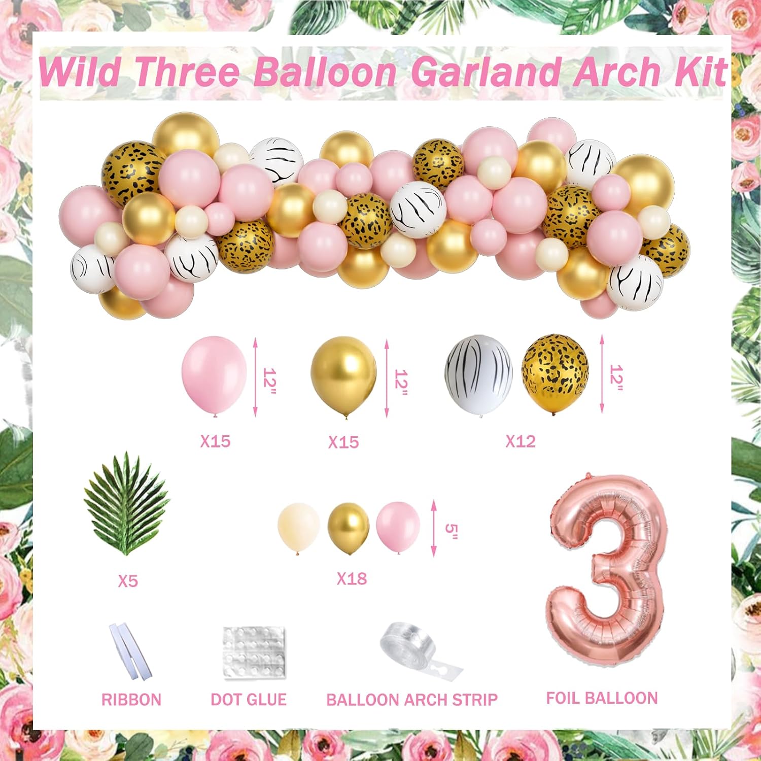 Young Wild and Three Birthday Decorations Kit Includes:15 x 12’’ pink latex balloons 15 x 12’’ metallic gold balloons 6 x 12’’ zebra print latex balloons 6 x 12’’ cheetah print latex balloons 6 x 5’’ pink latex balloons 6 x 5’’ metallic gold balloons 6 x 5’’ nude latex balloons 5 x artificial leaves 1 x 32’’ number ‘3’ number foil balloon 1 x 18’’ ‘wild three’ foil balloons 1 x backdrop 1 x banner 1 x tablecloth 1 x cake topper 20 x 9’’ plates 20 x 7’’ plates 20 x napkins 20 x cups 20 x straws 20 x knives 20 x spoons 20 x forks balloon strip glue dots ribbons [Tips] ① It is recommended that the balloon be inflated by 90%. ② Filling with helium makes foil balloons between 22-inch and 36-inch float. ③ Please use a balloon pump (not included) for the balloon garland. This product is from Hombae brand.