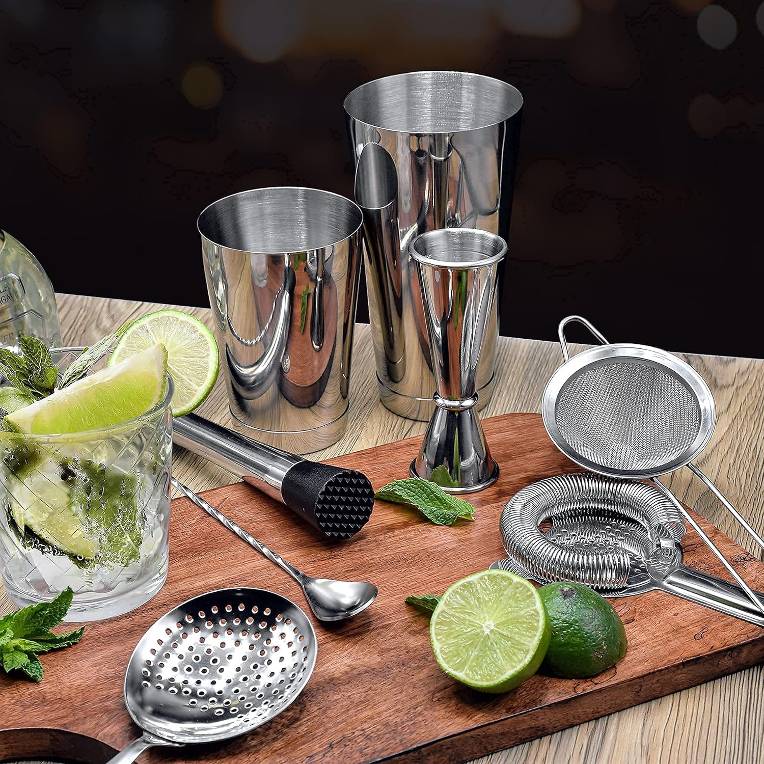 Cocktail Strainer and Shaker Set - Hawthorne Strainer, Julep Strainer, Fine-Mesh Sifter, Stirring Spoon, Boston Shaker, Jigger and Muddler