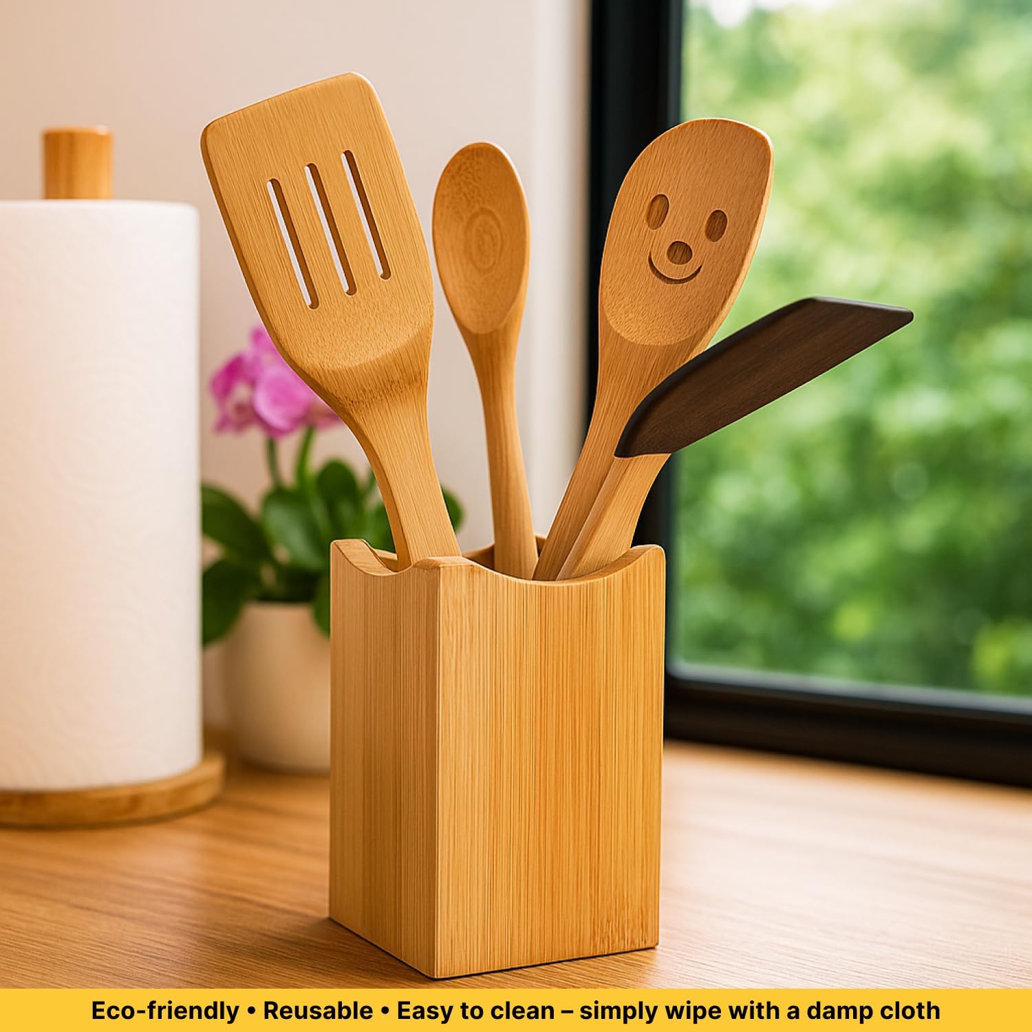 Organize your kitchen in style with this Bamboo Utensil Holder, made from 100% natural bamboo—a durable, eco-friendly, and sustainable material. Measuring 4 x 4 x 5.5 inches, this compact countertop utensil organizer is perfect for storing cooking tools like spatulas, ladles, and whisks, as well as flatware such as forks, spoons, and chopsticks. The wide opening offers easy access to your essentials while keeping your kitchen clutter-free. Featuring a wavy-edged contemporary design, this holder adds a modern touch to any kitchen decor. Lightweight yet sturdy, it’s easy to clean—simply wipe with a damp cloth. Avoid soaking or dishwasher use to maintain its quality. A stylish and functional addition to any kitchen, this bamboo kitchen utensil holder supports sustainable living while keeping your tools neat and accessible.