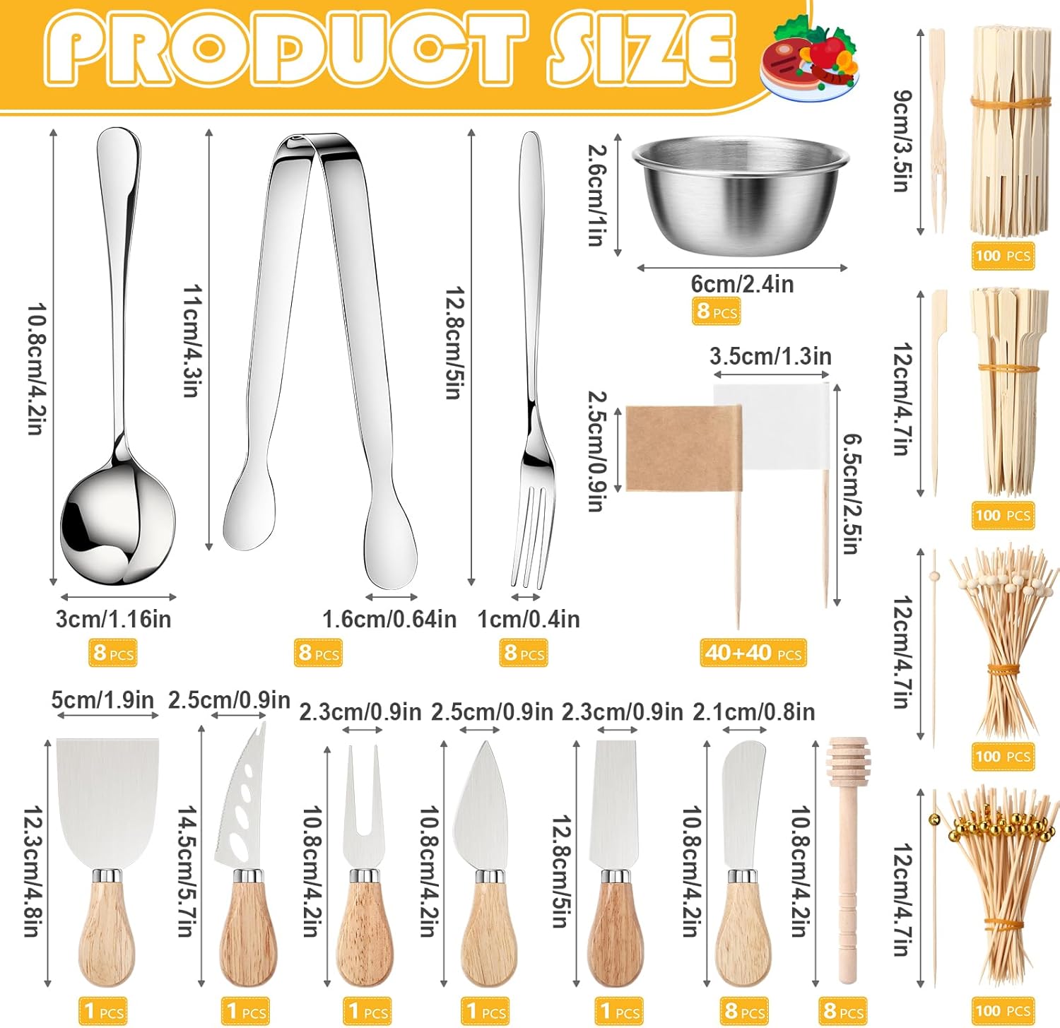 Specifications: Material: paper, stainless steel, bamboo Color: silver Size: Wooden handle butter spreader: 4.75 inches /12 cm to 5.5 inches /14 cm, honey spoon: 3.93 inches/10 cm, Fork: 5.11 inches/13 cm, spoon: 4.33 inches/11 cm, serving tongs: 4.33 inches/11 cm, Dip bowl: 2.38 x 1.02 inches/6 x 2.6 cm, cocktail picks: 4.7 inches /12cm Package includes: 1 x Butcher paper, 9 x Cheese knives, 8 x Mini tongs, 8 x Spoons, 8 x Forks, 8 x Dipping bowls, 8 x Honey spoons, 80 x Toothpicks, 400 x Cocktail picks Notes: Manual measurement, please allow slight errors on size. The color may exist a slight difference due to different screen displays
