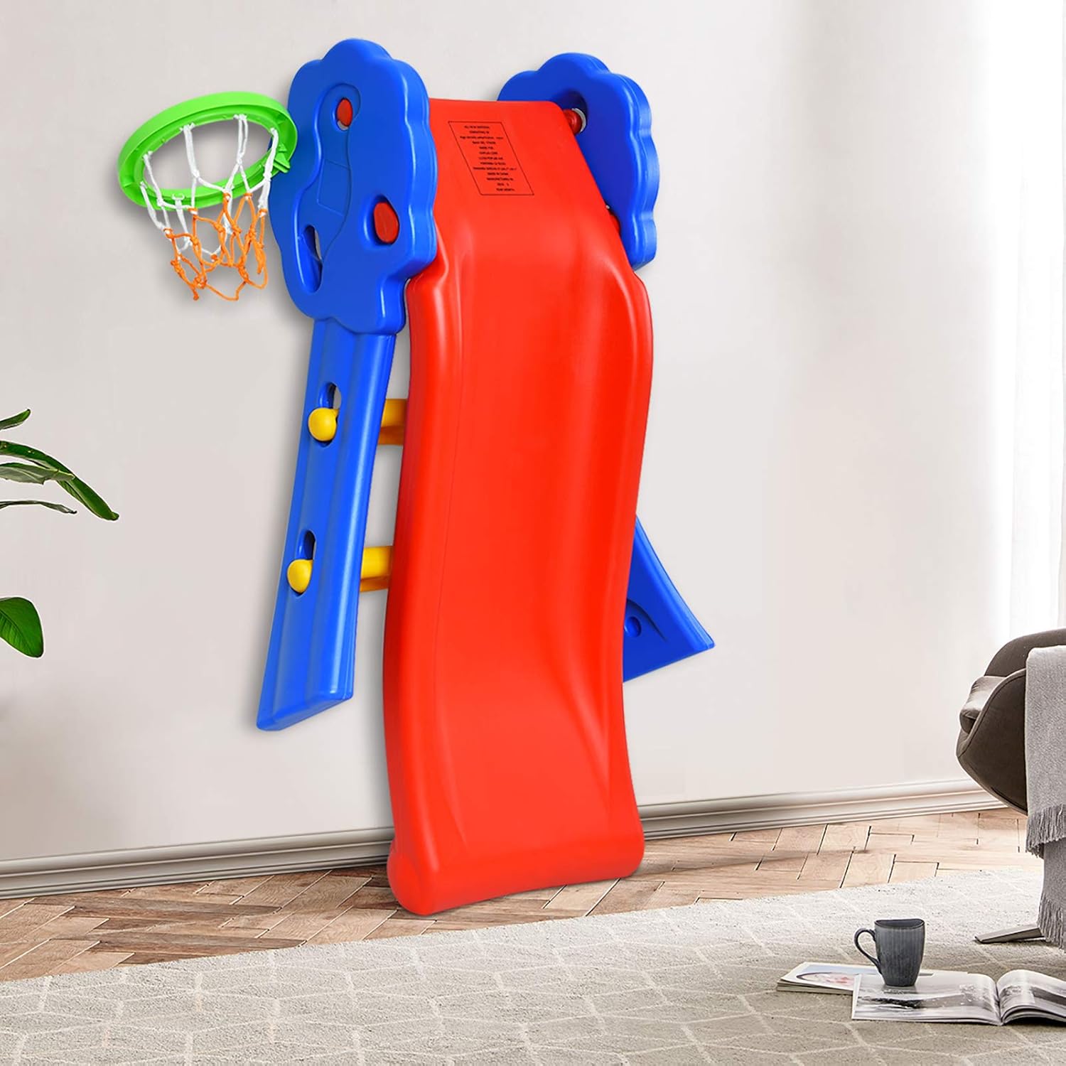This children play set has 2 functions - toddler slide and anti-slip climber. The slide is just the right size for your little one, providing your kids and their friends hours of fun and active play. It folds and unfolds in seconds, which makes it easy to store. This freestanding slide can exercise toddler’s physical coordination ability and cultivate little kid's adventure and brave spirit.Features:Durable and non-toxic HDPE material Gentle slope and easy-to-climb stepsRounded edges and corners for added safetyEasy to be folded and stored so that will save space Designed for indoor and outdoor useEasy assembled requirement lightweight for carrying Specifications:Color: Blue + Red + YellowMaterial: HDPEOverall Dimension: 42.5” x 24” x 28” (L x W x H)Net Weight: 9 lbsWeight Capacity: 110 lbsPackage includes :1 x Children slide1 x Instruction