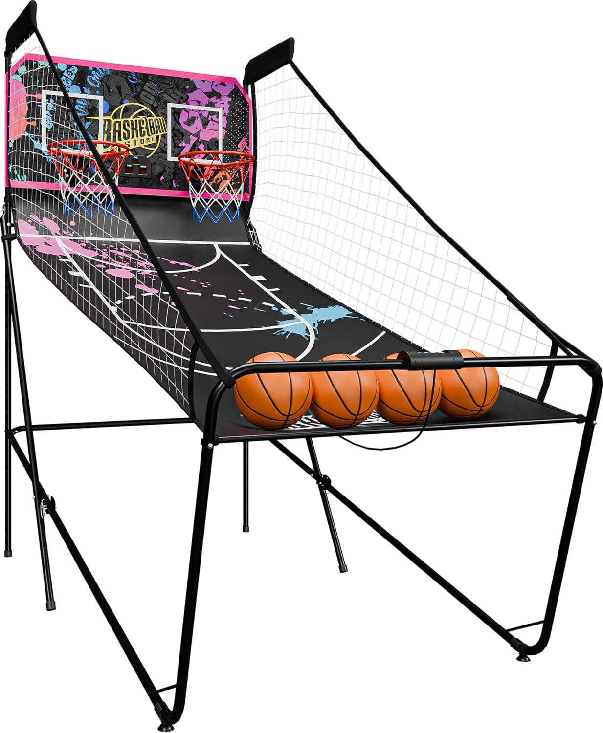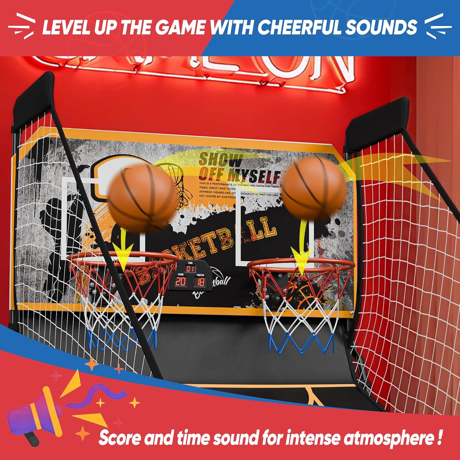 FeaturesThicker and sturdier backboard is very solid for long-term use.8 Different options for the interactive game, will provide endless fun!DIY assembly is also fun, people can enjoy hours of interactive playWith its own electronic scoring system, you can play the game at home!This product can also be used for various activities such as store promotion, advertising, etc.Specifications:Material: Steel Pole, MDF Panel, Polyester Fabrics Height of Rim: 33.5" Diameter of Rim: 12" Size of Board: 42" x 20.5" x 0.35" (L x W x H) Width: Side To Side: 43" Height: Top To Bottom: 80" Weight: 37 lbs Package Include:Double Shot Electronic Basketball x 1 Scoring Display x 1Pump Needle x 1 Ball x 4 Hoop x 2 Net x 2 Sensor x 2 Battery Not Included