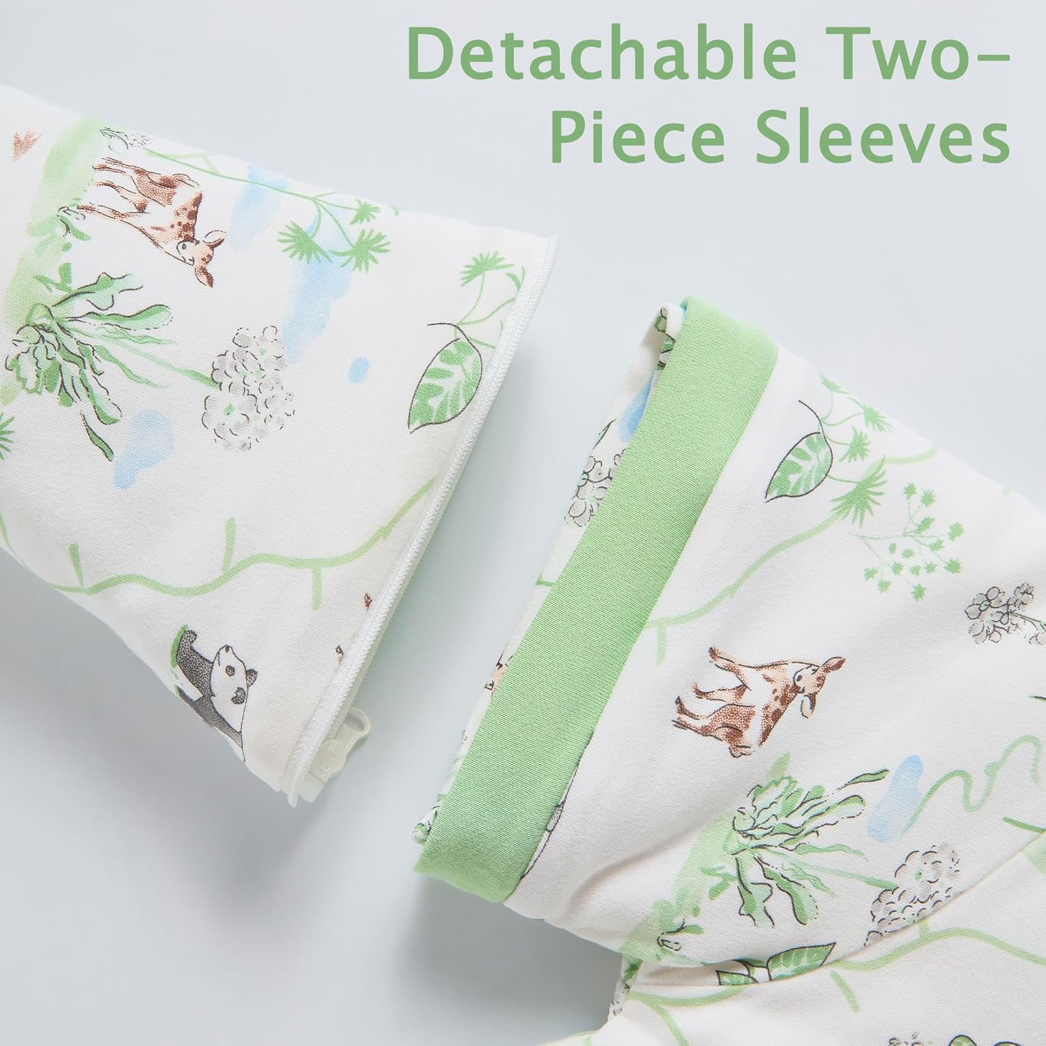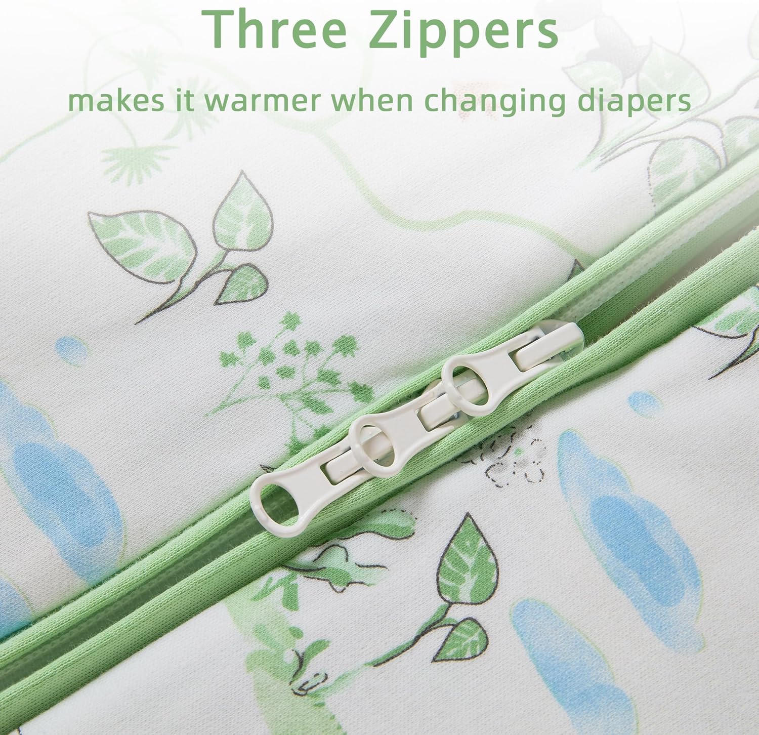 Our baby sleeping bag is generally oversized. It is suitable for babies in three stages: 0-6 months, 6-18 months, and 18-30 months. This Winter Baby Wearable Blanket has 2.5 tog insulation, which is the perfect thickness to keep babies cozy without overheating during cold winter nights. Made of soft and breathable cotton, this toddler sleeping bag is gentle on baby boy and baby girl’s sensitive skin, reducing irritation during long sleep hours. The unisex style comes with 3 adorable prints (Deer+Rabbit+Trees, Deer+Panda+Ostrich, Leopards+Trees) that fit any nursery theme. What makes our sleep sack stand out? Three key designs that make parenting easier: 1. 3 Independent 2 - Way Zippers: Unlike regular sleep sacks, our baby wearable blanket is equipped with 3 separate 2 - way zippers. They are quick to put on and take off, convenient for midnight diaper changes, and secure to prevent accidental unzipping. It's a game - changer for busy parents caring for newborns or toddlers. 2. Sleep Sack with Feet & Legs: As a practical sleeping bag with legs, this baby sleep sack allows little ones to move freely (crawling, kicking) while staying covered. It solves the problem of traditional blankets slipping off and is suitable as a newborn sleep sack or toddler wearable blanket, adapting to growing babies. 3. Detachable Sleeves: Our 2.5 tog sleep sack in winter style features half - detachable sleeves (zipper - connected upper and lower sleeves). You can remove the lower sleeves to adjust for milder winter days or keep them on for extra warmth. This flexibility makes it a great choice for all winter temperatures, fitting babies from 0 - 6 months to 18 - 36 months. Available in sizes S/M/L to grow with your baby, it also makes a great gift for new parents. Whether you're looking for a newborn sleep sack for your tiny one or a toddler wearable blanket for your active tot, our 2.5 Tog Winter Sleep Sack checks all the boxes: safety, comfort, and convenience. Add it to your cart today and let your baby sleep soundly all winter long!