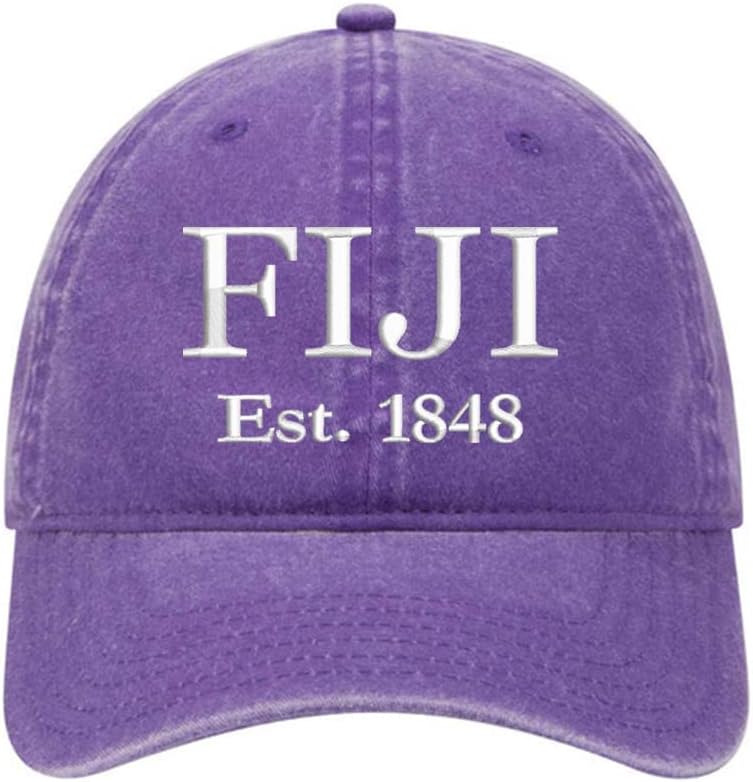 Phi Gamma Delta Fraternity Embroidered Baseball Cap - FIJI Beach Washed cotton twill hat with Greek letters embroidered across the front in white thread. White hat has purple thread. Our popular pigment dyed garment washed cap has a lived-in look with a soft crown lining. Great for all year round. Low Fitting - Unstructured 6 Panel Cap 6 Sewn Eyelets Pre Curved Visor 4 Rows Stitching on Visor Matching Fabric Under Visor Metal Press Buckle Size: OSFM - Adult (58cm/22.8")