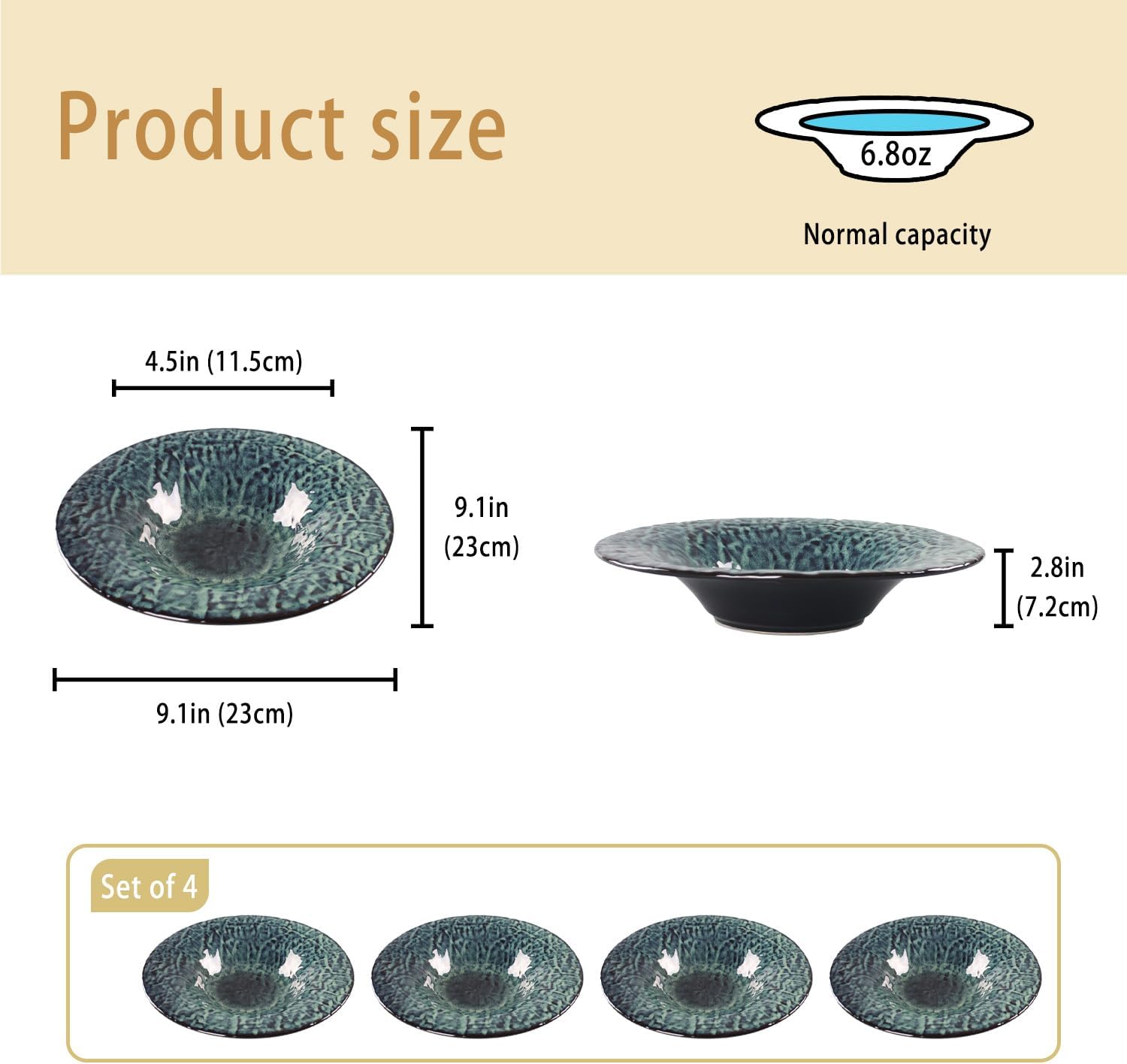 LIUYWYHCF Ceramic Pasta Bowls, 6.8 oz Pasta Plates, Reactive Glaze Pasta Bowl Set of 4, Large Wide Serving Bowls for Salad, Dessert, Fruit, Microwave & Dishwasher, Oven Safe DIMENSIONS - This deep pasta bowl is 1.8 inches deep and 8 inches in diameter, which can meet the needs of most families. The 6.8 oz/4-piece pasta bowl set is perfect for serving soup, nuts, salad, fruit, and noodles, making it a perfect gift for a housewarming party, wedding, Mother's Day, Father's Day, or Christmas. It is perfect for family dinners, food storage, breakfast oatmeal, restaurant service, parties, and more. ELEGANT AND STYLISH DESIGN - This Pasta Bowls leads the dining trend with its expressive colors and finishes. With its vibrant color palette and captivating finishes, it creates an alluring ambiance that exudes warmth. The eye-catching reactive glazes and rich, vivid hues not only soothe the senses but also elevate your dining experience. The generously-sized plates provide ample space for displaying your delectable creations, while their deep bottoms prevent any sauce from spilling over. LEAD FREE EAT SAFTY - Our Pasta bowls set is made of Ceramic material and features an all-natural glaze that is lead-free, cadmium-free. The set is fired at a high temperature of 2340℉ for 17 hours to ensure its durability and safety. With this dinnerware set, you'll never have to worry about any health problems. Withstands 500 F°, for Oven, Dishwasher and Microwave Safe. UNIQUE AND SCRATCH RESISTANT - Our ceramic bowls sets are fired with two different glazes,The reactive glaze make every plate is unique,Since our glaze is all-natural reactive finish, the surface of plates would change color on lighting,So Our glaze is also extra strong to prevent scratches from your knives and forks. Please note dark marks may occur silverware, which are not scratches,it is very easy to remove. ELEVATE EVERY MEAL - Perfectly blends affordability and modern design into our pasta bowl. Whether it's a comfortable family breakfast or a lively gathering with friends, our fashionable cutlery collection can enhance your dining experience in any occasion.