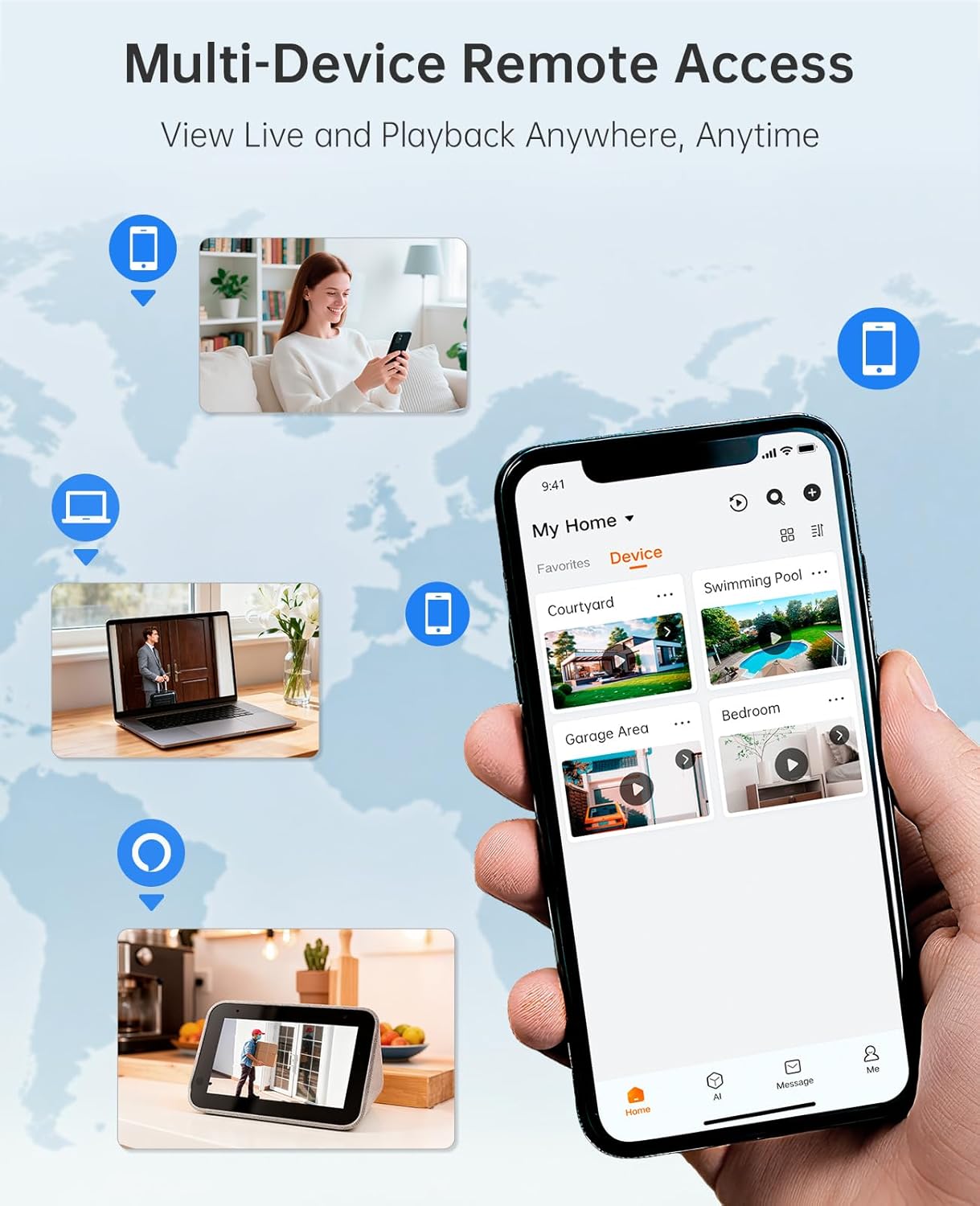 • AI Detection & Instant Alerts – Smart detection identifies humans and vehicles, sending real-time notifications to your phone and reducing false alarms for your home security system.