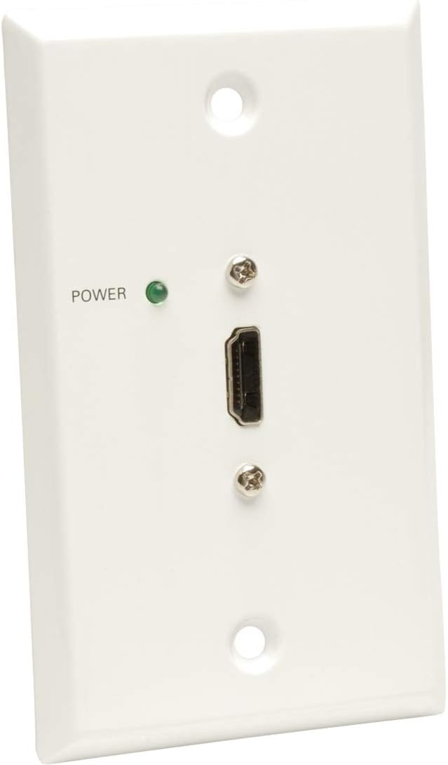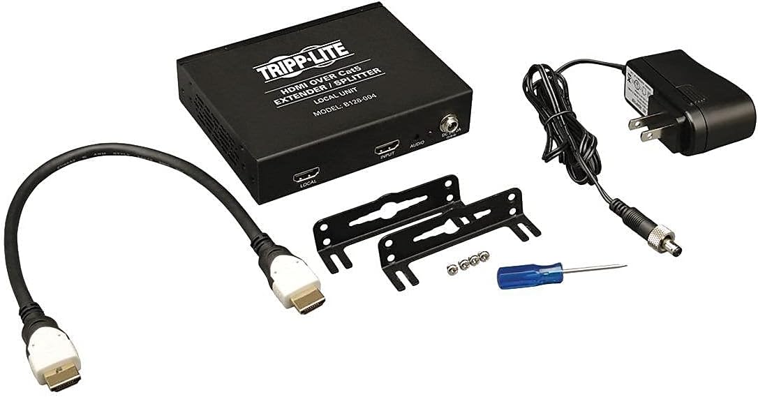 The B126-004 4-Port HDMI over Cat5/Cat6 Extender/Splitter works with Tripp Lite B126-Series remote receivers to split a single HDMI audio/video signal into five separate signals—one local and four remote. It’s ideal for digital signs, trade shows, presentations, retail settings and other applications where the video source is located farther than conventional cables allow or that require multiple displays connected to one source. It uses HDMI cable (see Tripp Lite’s P568-Series) to connect to the source and the local monitor and Cat5e/6 cable to transmit to the remote monitors (for best results, use 24 AWG solid-wire Cat5e/6 cable, such as Tripp Lite’s N202-Series).When used with Tripp Lite’s B126-1A0 or B126-1A0-WP-1 active remote receivers, the Extender/Splitter can extend a 1080i (60 Hz) signal up to 200 ft., a 1080p signal (60 Hz) up to 150 ft. and a 3D signal up to 125 ft. With a B126-1P0 or B126-1P0-WP-1 passive remote receiver, it can extend a 1080i (60 Hz) signal up to 100 ft. and a 1080p (60 Hz) signal up to 50 ft. By daisy-chaining up to three Extender/Splitters, one video source can transmit to as many as 13 monitors—one local and 12 remote. Add up to three B126-110 remote repeaters to each channel to fully extend the signal range or add more displays.In addition to crystal-clear video, the B126-004 delivers full, rich stereo and 7.1-channel surround sound (multi-channel or PCM) audio. Easy to set up with no software or drivers to install. Mounts to a wall, rack or pole using the included hardware. Included HDMI cable with latching connectors provides a more secure connection.