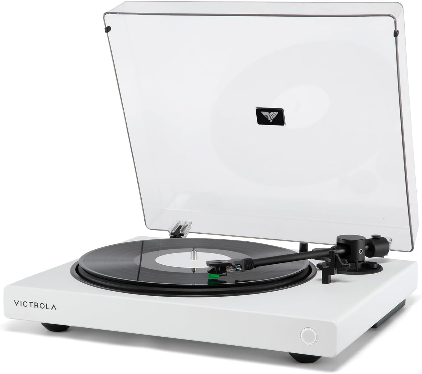 The Victrola Wave turntable delivers high-fidelity vinyl playback with premium materials and advanced connectivity for a superior listening experience. Designed with a low-resonance MDF plinth, precision aluminum platter, and anti-vibration silicone slipmat, it minimizes unwanted vibrations for cleaner, more detailed sound. The Audio-Technica AT-VM95E cartridge and lightweight aluminum tonearm ensure accurate tracking and balanced, distortion-free playback across every record. With Auracast Broadcast technology and hi-res Bluetooth streaming, you can wirelessly connect the Wave to compatible speakers and headphones with enhanced range, stability, and audio quality. A switchable preamp and RCA output give you the flexibility to connect to powered speakers, traditional stereo systems, or external amplifiers, while Bluetooth connectivity allows you to easily stream music from any device. Designed with intuitive front-facing controls, a removable headshell for easy cartridge upgrades, an easy-set counterweight, and a protective dust cover, the Wave is crafted for vinyl enthusiasts of all levels. Combining performance, versatility, and a modern design aesthetic, the Victrola Wave is the ideal centerpiece for your home audio setup.