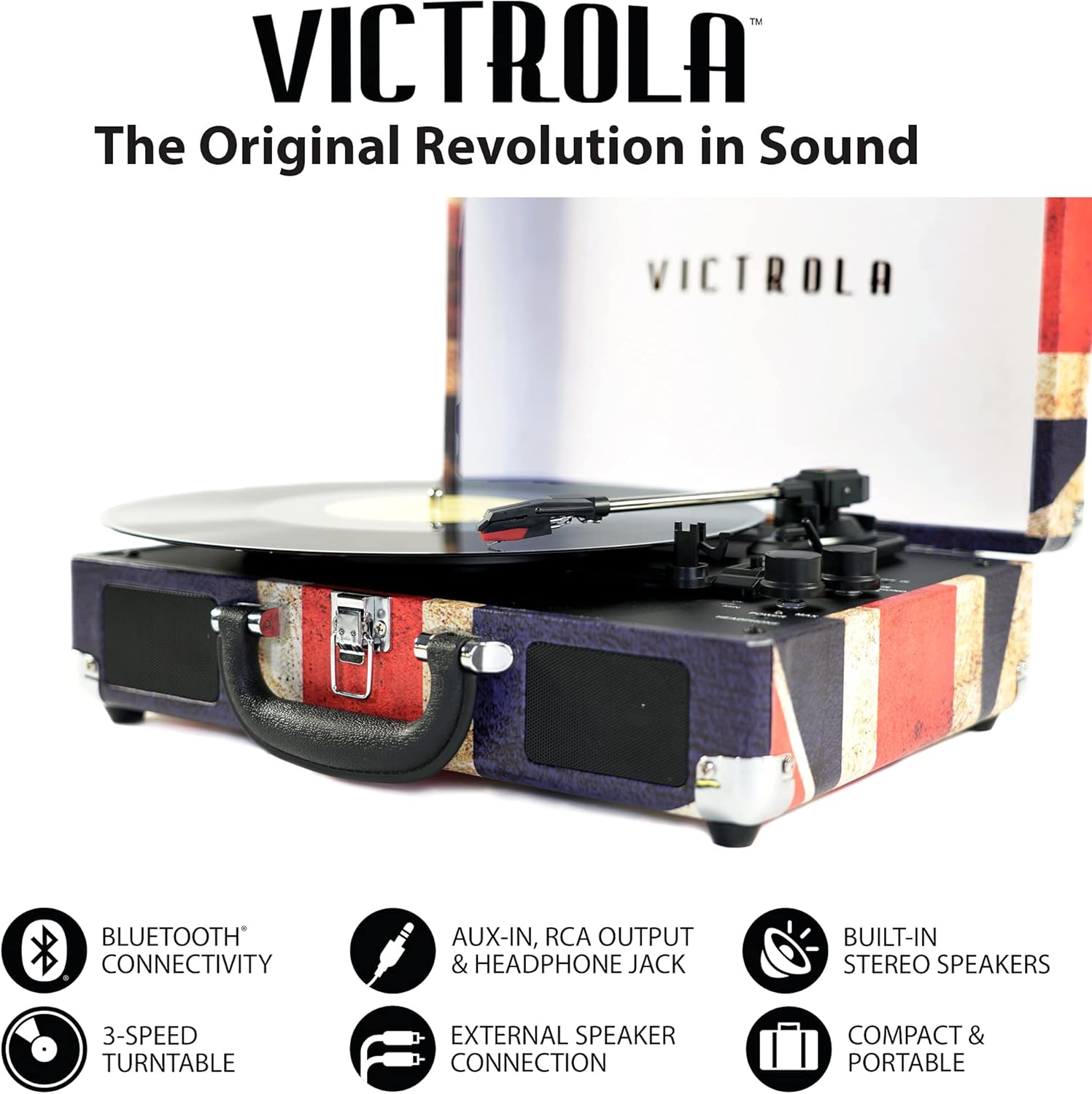 Victrola Vintage 3-Speed Bluetooth Portable Suitcase Record Player with Built-in Speakers | Upgraded Turntable Audio Sound| Includes Extra Stylus | American Flag (VSC-550BT-USA) AmercanThe Victrola portable suitcase record players classic design lets you take your tunes anywhere! A portable design with convenient carry handle, 3-speed belt driven turntable and built-in Bluetooth speakers seamlessly play smartphone audio for all to enjoy! Additional features include a custom tuned Pre-Amp for improved audio clarity and bass performance, 3.5mm Aux-In, RCA outputs, and a headphone jack - all great features to enjoy your music at home or on the go!Victrola Vintage Bluetooth Portable Suitcase Record Player with Built-in Speakers, 1SFA (VSC-550BT-UK)The Victrola portable suitcase record players classic design lets you take your tunes anywhere! A portable design with convenient carry handle, 3-speed belt driven turntable and built-in Bluetooth speakers seamlessly play smartphone audio for all to enjoy! Additional features include a custom tuned Pre-Amp for improved audio clarity and bass performance, 3.5mm Aux-In, RCA outputs, and a headphone jack - all great features to enjoy your music at home or on the go!