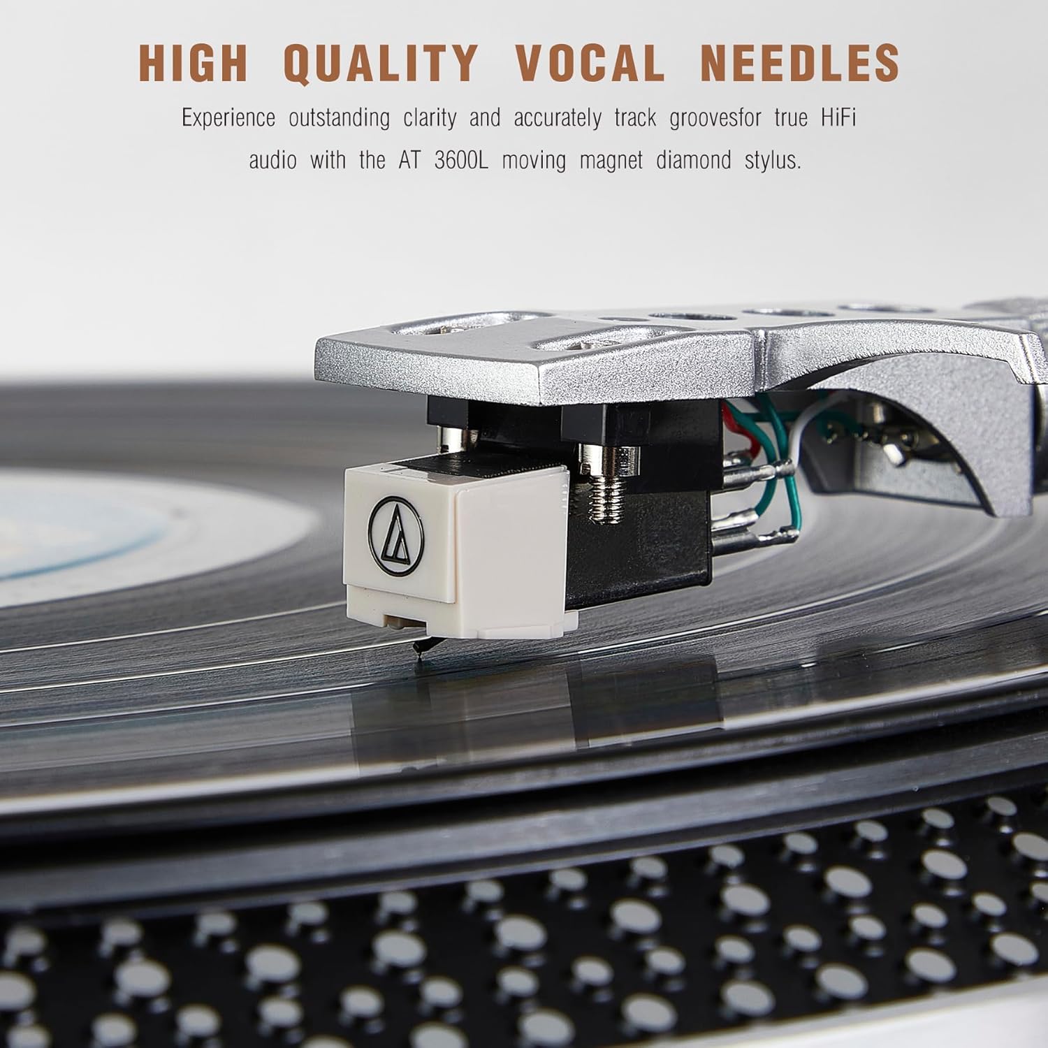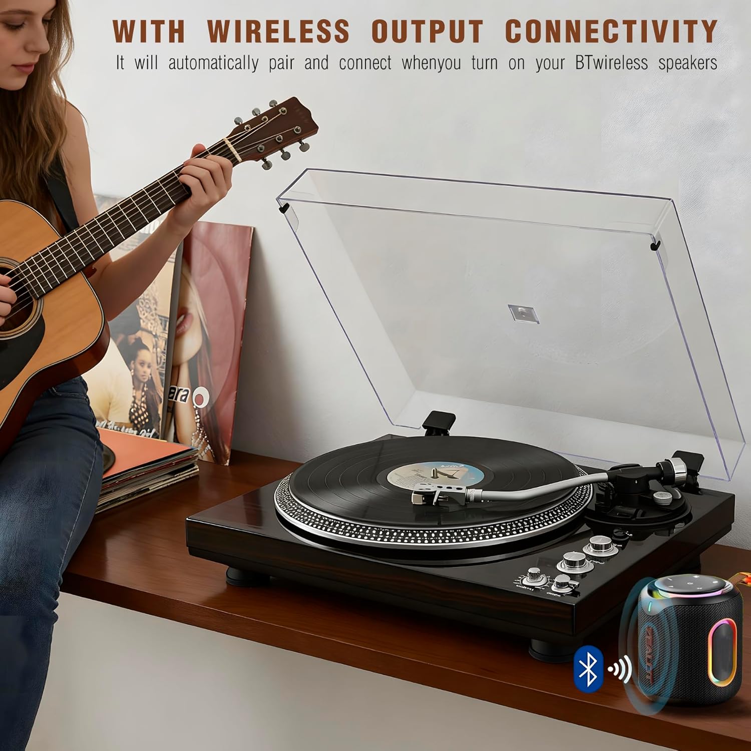 | Additional Features | Built-In Switchable Phono Preamp, RCA Line-Out & Bluetooth Transmitter, Magnetic Cartridge, Detachable Headshell & Die-Cast Aluminum Platter, Manual Belt Drive with Variable Pitch Control & Strobe Light, Premium Wood Grain Finish & Protective Removable Dust Cover, S-Shaped Tonearm, Auto-Return, Adjustable Counterweight & Anti-Skate |