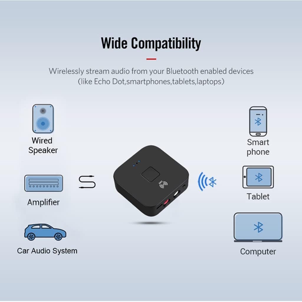 It complies with version 5.0 specifications and is backward compatible with 4.2/4.1/4.0/3.0/2.0/1.0.Low-latency audio ensures that your device can provide sound synchronized with visual media.It reduces latency and improves the end-to-end speed of audio transmission, thereby providing synchronized user experience.You can enjoy the freedom of in applications such as games and watching videos.Built-in chip, you can directly connect to NFC mobile phones or other devices that support NFC by touching this receiverWith 3.5mm and 2RCA connection options, you can enjoy music wirelessly on 2 speakers at the same time.Equipped with 3.5mm and 2RCA audio port, suitable for more devices (including 3.5mm cables and 2RCA cables).The adapter supports connections up to 10 meters/33 feet, and can control music playback from a distance.Use the charging cable to connect your car/other power source. When the car starts or has electricity, it will automatically turn on and automatically connect to the device you connected last time. When the car is turned off, it will automatically turn off.This 5.0 receiver can be connected to any A/V receiver with a standard 3.5mm jack or 2RCA port and any active speakers. It is very suitable for home theater, stereo system and car audio, as well as , , Touch, Smart phones and Android devices.Note:Due to the different monitor and light effect, the actual color of the item might be slightly different from the color showed on the pictures. Thank you!Please allow 1-2cm measuring deviation due to manual measurement.Quantity : 1 PCS