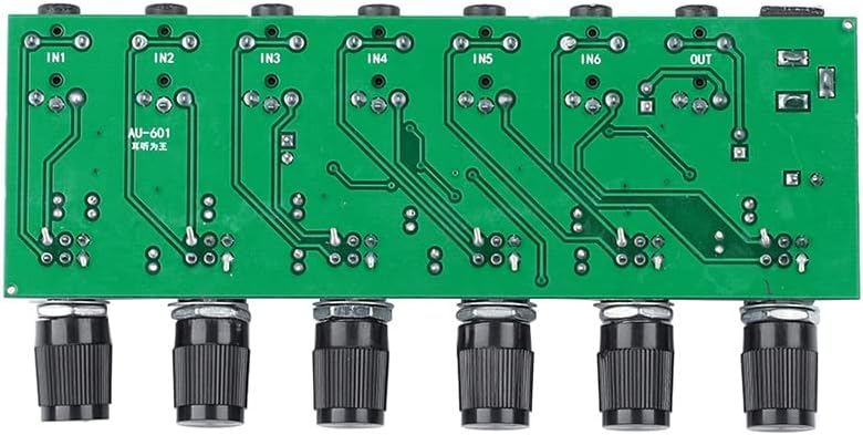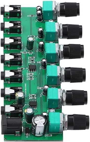 FeatureThe six stereo audio inputs are mixed into a stereo output, which can directly drive headphones or connect to a power amplifier, 3.5mm headphone socket, and a potentiometer to individually control the volume of each channel without affecting each other.Adopt Taiwan 09 potentiometers, quiescent current is about 15ma, low-noise 4580 operational amplifiers, the highest power supply can reach 24V, and the magnification is about 2 times.Please use a low-ripple power supply for power supply, and use shielded wires for audio cables, which is conducive to signal purity.Package included:1*mixer board(power plug is not included)Chip protection, overvoltage undervoltage overheat DC short circuit detection.