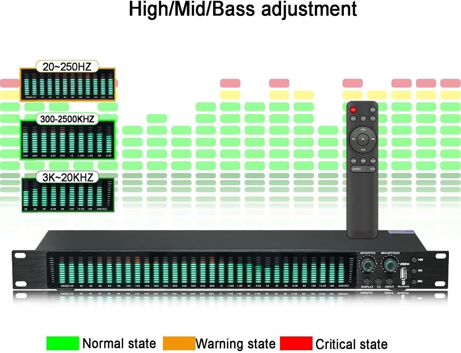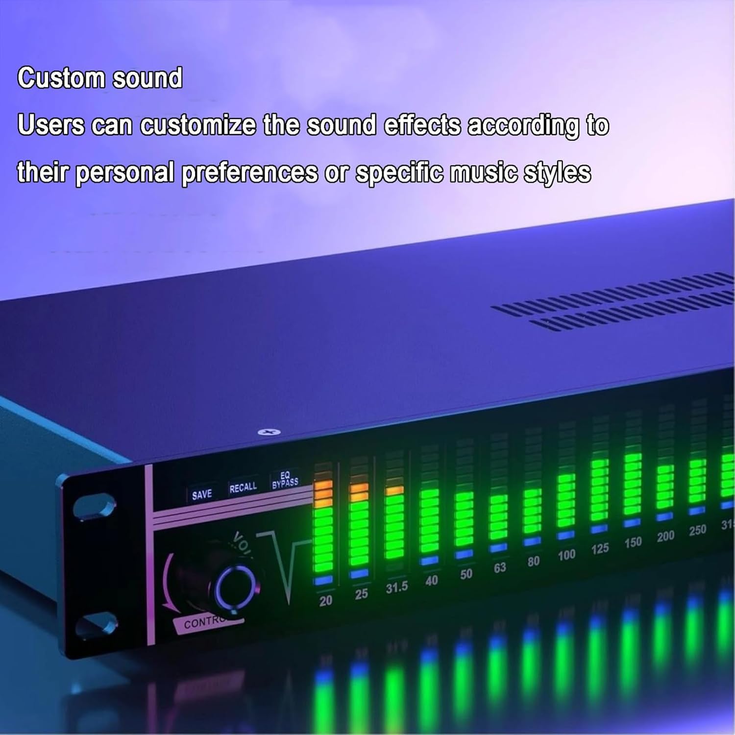 Product Name: 31-Band Spectrum Display Audio EqualizerDigital Sampling Rate: Premium 24-bit/48K high-resolution sampling for studio-grade audio fidelity3-Band Independent EQ: Adjustable treble, midrange and bass with ±12dB boost/cut range for pinpoint sound shapingLED Indicator System: Tri-color (red, yellow, green) LED display with 3 adjustable levels for real-time visual monitoringProfessional Audio Performance: 99% spectrum accuracy, dynamic range exceeding 108dB, and 82dB signal-to-noise ratio for crisp, distortion-free audioPreset & Control Features: 21 savable/recallable spectrum presets, 5 selectable EQ bypass modes, and dual transmit gain options (-1dB / 11dB)Electrical Specifications: 15kΩ line input impedance, 300Ω line output impedance, wide 20Hz-20kHz frequency responsePower & Physical Data: 30W power consumption, universal AC110-220V 50Hz power supply; compact dimensions 480 x 49 x 155mm (6mm power jack included, external posts excluded); lightweight 1.6kg buildWHAT’S IN THE BOX- 1 x 31-Band Spectrum Display Audio Equalizer- 1 x Wireless Remote Control for effortless distant operationMy dear customer friends, we are committed to becoming one of Amazon's best-selling products, providing you with high-quality products and services. We wish you a pleasant shopping experience!After sales service: Thank you very much for purchasing our product. If you have any questions after receiving the product, we hope you can contact us and we will do our best to solve them for you.