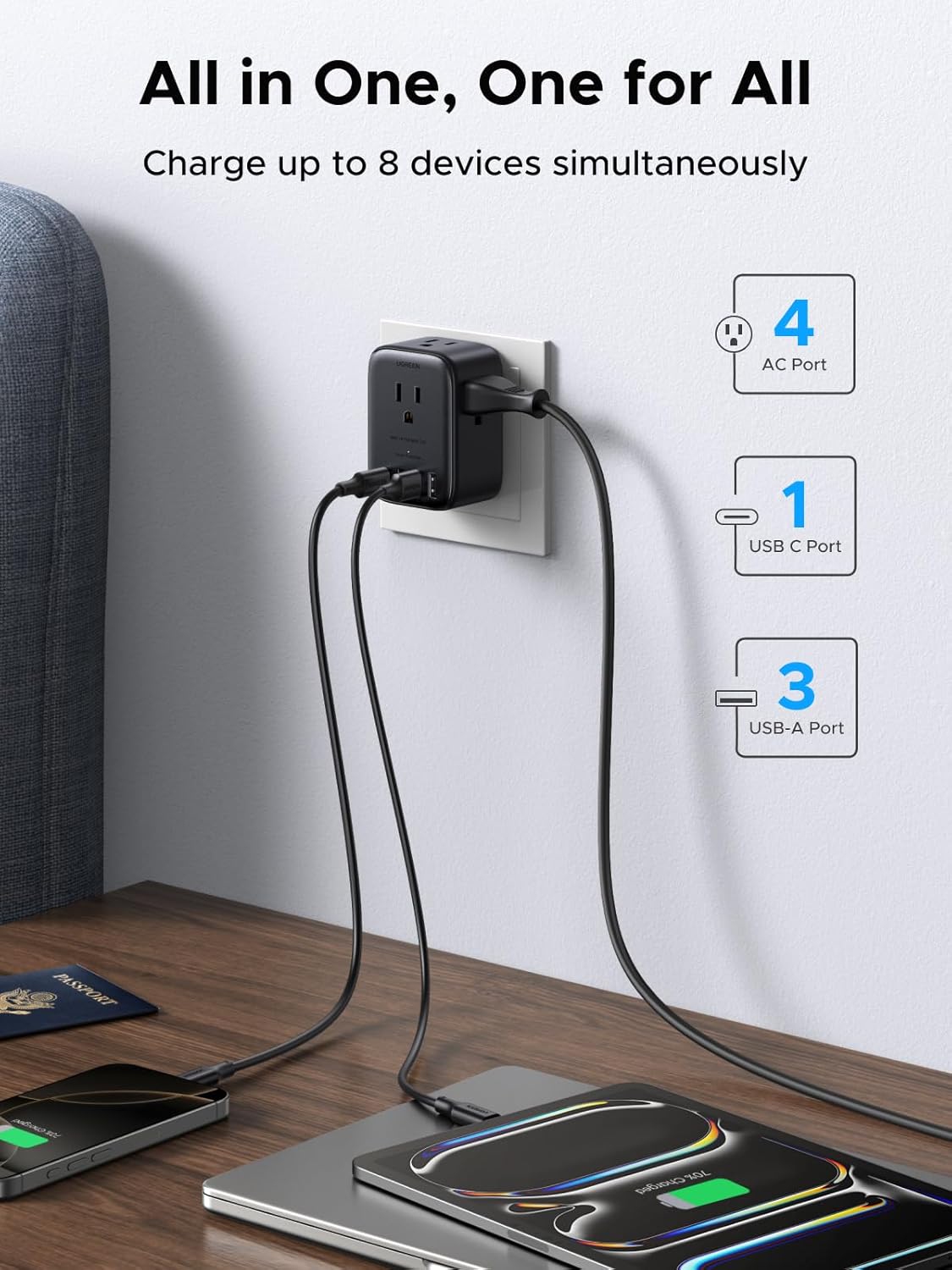 This bundle includes a 45W 2-Port USB-C charger with a retractable cable and a 20W 4AC+4USB power strip. The 45W charger delivers fast and safe charging for iPhone 16/15/14/13, iPad, MacBook Air, Samsung Galaxy S25/S24, and other devices, with the retractable cable adding portability and convenience. The power strip provides 4 AC outlets and 4 USB ports, supporting 20W fast charging for compatible devices. Both products feature safety protections, ensuring reliable and efficient charging for multiple devices at home, office, or during travel.