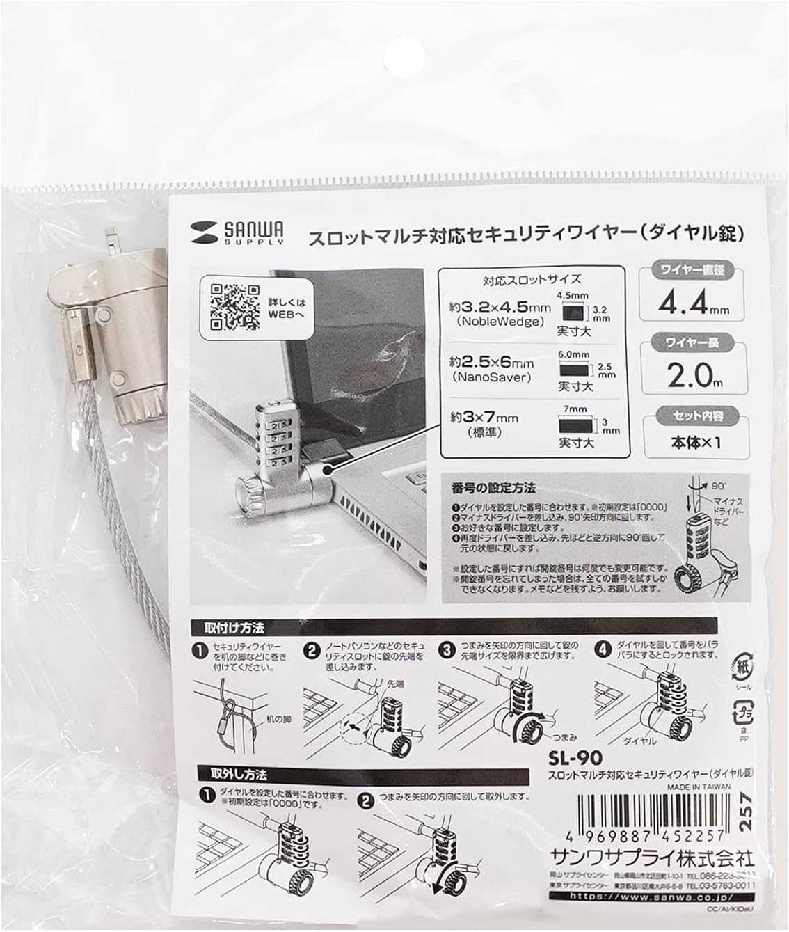 ● Security wire compatible with all 3 types of standard, Noble and Nano. You can set a 4-digit password code. (You can change the code as many times as you set it.) The tip can be adjusted steplessly by turning the dial on the cylinder part. The cylinder and tip part can be rotated 360°, so you can use it without any load on the wire. ● The surface of the wire is vinyl coated, so it prevents scratches on the device during installation and transportation. Compatible with all standard locks 3 x 7 mm, Noble locks 3.2 x 4.5 mm, and 2.5 x 6 mm Nano locks. If you forgot your password, you cannot unlock it unless you try all numbers or cut the hardware. Please leave notes and other items. ■Size: Cylinder size (diameter)/approx. 0.7 inches (18 mm) (including dial part) 1.9 inches (48.5 mm) Wire length: 6.6 ft (2 m) Wire Diameter: 0.1 inch (4.4 mm) ■Weight: Approx. 5.6 oz (158 g). ■ Compatible Slot Size: 0.1 x 0.3 inches (3 Also compatible with all 0.1 x 0.18 inches (3.2 x 4.5 mm), 0.1 x 0.2 inches (2.5 ■ Mountable Slot Name: Kensington (Standard) Compatible with all NobleWedge and Nano Saver products. ■Number of PIN Numbers: 4 digits ■ Wire Material: Zinc (with vinyl coating) ■ Set Includes: 1 x Security wire main unit