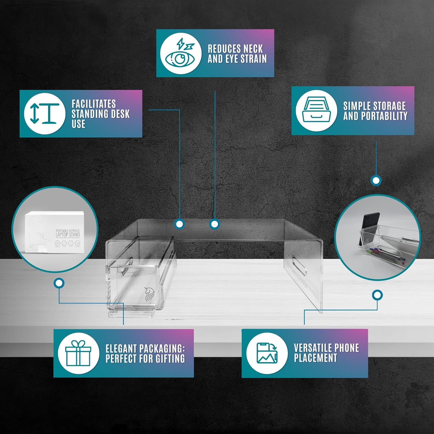 The Ahanicorn Acrylic Laptop Stand was to make ergonomic laptop use available to you wherever you work, whether at a desk, coffee table, in bed, or standing up. The ergonomic design reduces strain on your neck and eyes, and the notebook riser raises your laptop 6 inches for a better working posture.The stylish clear acrylic design with curved corners makes it compatible with any setting, while contributing to safety, style, and sturdiness. Built with handles, you can conveniently transport and store your power source, cellphone, and other accessories with your laptop all at once from room to room all at once. The built-in handles and accessory bin allow you to easily move from desk to coffee table to bed. The ambidextrous mobile phone bracket can be attached to either side of the tray for optimized horizontal experience. The acrylic cellphone stand attachment allows you to hold your phone in portrait or landscape mode, and the phone screen angles upward for more ergonomic visibility.The stand is specifically compatible with the 16-inch Macbook Pro and any laptop up to 16 inches. The phone stand is compatible with all mobile phones. We're confident you'll love the Ahanicorn Acrylic Laptop Stand. If not, contact us for a full refund within 30 days.