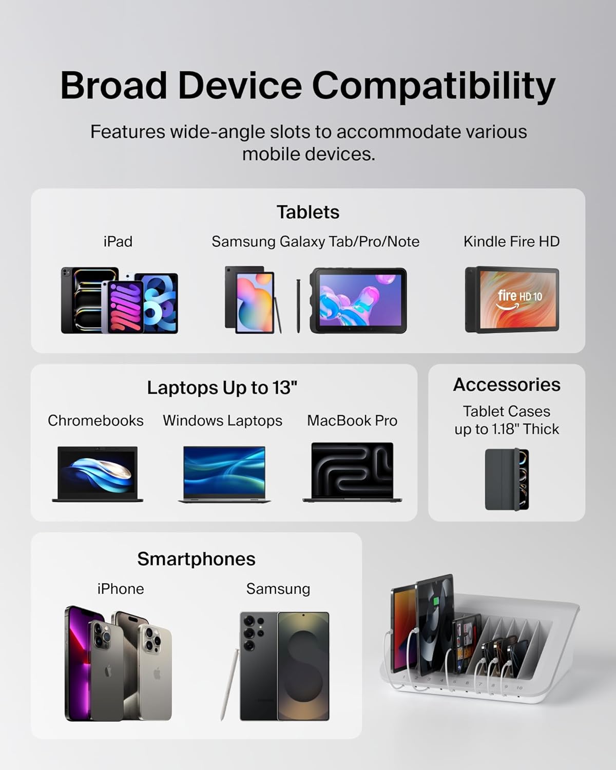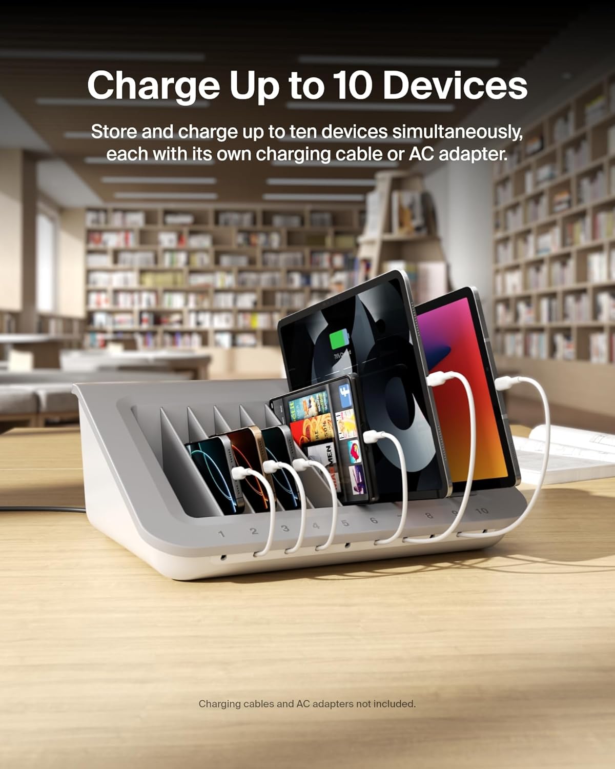 Less hassle, more learning! The Belkin charging station is the perfect way to keep tablets, laptops, and e-readers organized and charged in the classroom. This product was designed specifically for K-12 learning environments and can easily store and charge up to 10 devices at the same time, each with its own charging cable/AC adapter. This charging station fits all iPad generations, Samsung Galaxy, Chromebook, e-readers, and laptops (up to 13-inches). This multi device charging station has built-in cable management that helps with classroom organization. Plus, this product’s open design allows devices to sync wirelessly. Additionally, a built-in surge protector provides protection against voltage spikes, and cable management minimizes clutter. Small footprint and surface mounting features allow the unit to be securely attached to tables or carts, 10 convenient surge protected AC outlets fit most charging adapters. This charging station offers an accessible and affordable mobile device management solution. Our Belkin Store and Charge Classroom Charging Station is backed by a Belkin Lifetime Warranty and a $15,000 Connected Equipment Warranty.