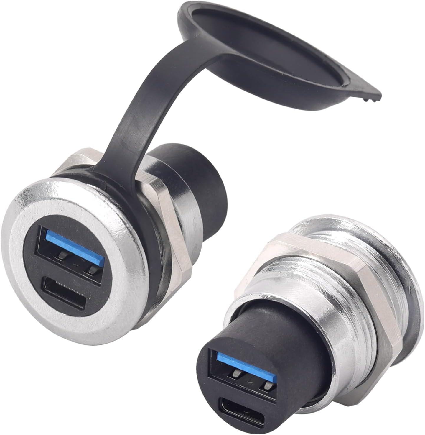 SPECIFICATION Connection port 1: USB 3.0 Female Connection port 2: USB Type C 3.1 Female USB 3.0 (data transmission: 5Gbps, charging: 5V 1A) USB C 3.1 (Data Transfer: Theoretical Max 10Gbps, Charging: Max 50V 1.5A) Design: Panel Mount Mounting hole pitch: 19mm*24mm Opening Diameter: φ24mm (φ0.94in) Case: Zinc Alloy Dual-Channel Powerhouse Front & Rear Access: Install in dashboards, server racks, or desk panels for bidirectional access True Simultaneous Use: Charge a phone via USB-C while backing up a hard drive on USB 3.0 data transfer Smart Installation Solutions Universal D-type mount design: Compatible with most standard panels,such as 86 panels, XLR panels, equipment Cable Management Ready: Hidden cable routing channels keep setups clean Package Includes 5x Dual USB-C/USB 3.0 Adapter 5x Waterproof cap 10 Sets Stainless Steel Mounting Nuts Applications ✓ Car Audio Systems ✓ CNC Control Panels ✓ Smart Home Hubs ✓ DJ Equipment Racks ✓ Office Conference Tables