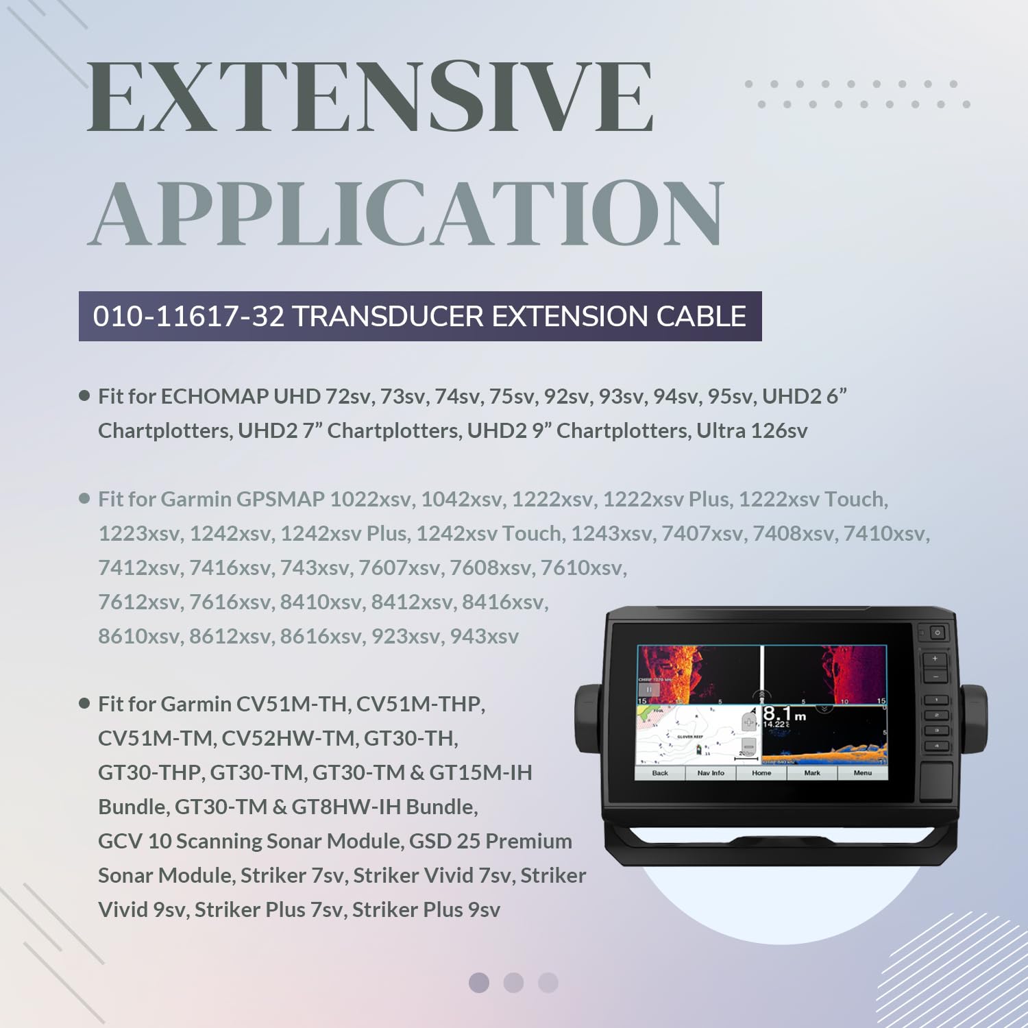 - 【Broad Compatibility】The 010-11617-32 Transducer Extension Cable is compatible with ECHOMAP UHD 72sv, 73sv, 74sv, 75sv, 92sv, 93sv, 94sv, 95sv, UHD2 6” Chartplotters, UHD2 7” Chartplotters, UHD2 9" Chartplotters, Ultra 126sv; for Garmin GPSMAP 1022xsv, 1042xsv, 1222xsv, 1222xsv Plus, 1222xsv Touch, 1223xsv, 1242xsv, 1242xsv Plus, 1242xsv Touch, 1243xsv, 7407xsv, 7408xsv, 7410xsv, 7412xsv, 7416xsv, 743xsv, 7607xsv, 7608xsv, 7610xsv, 7612xsv, 7616xsv, 8410xsv, 8412xsv, 8416xsv, 8610xsv, 8612xsv, 8616xsv, 923xsv, 943xsv