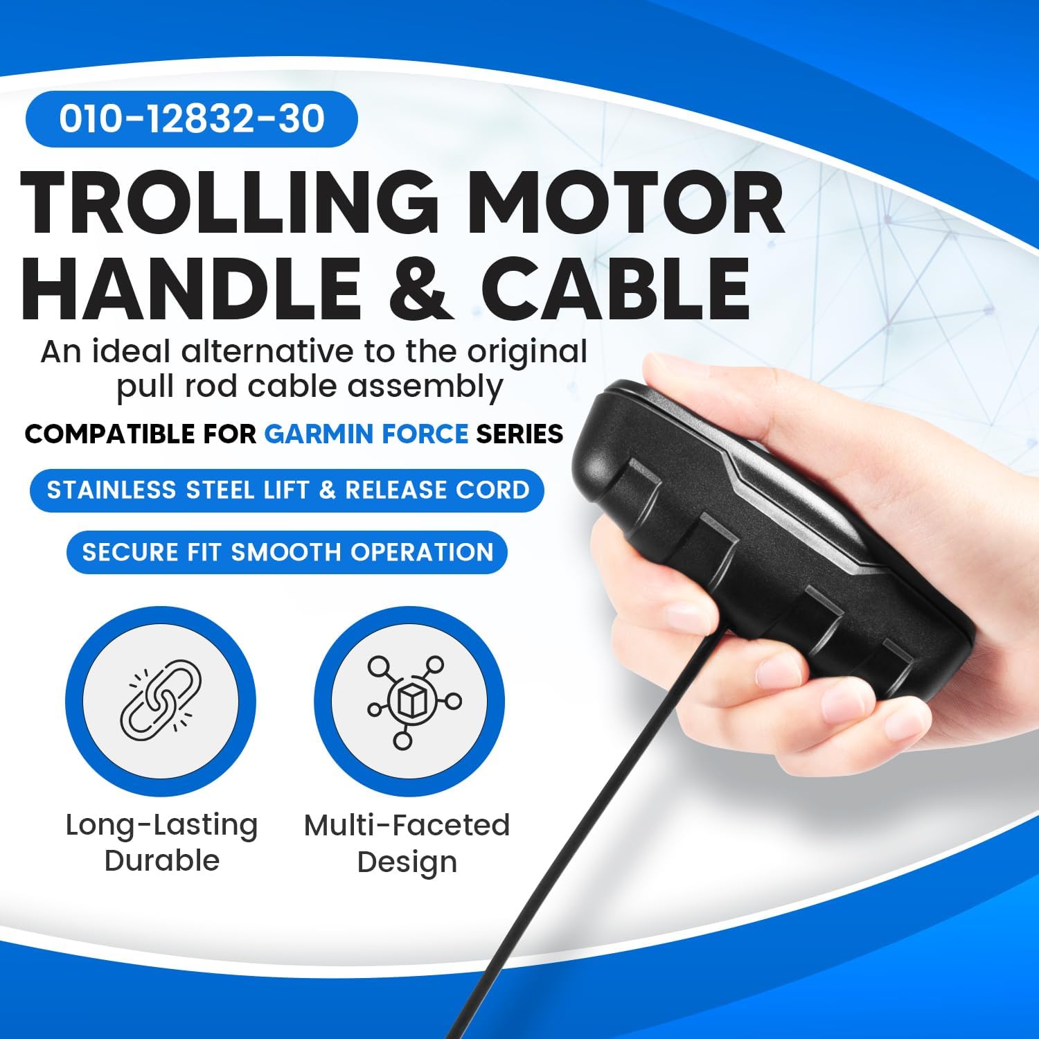 Features:Wide Application: Specifically designed to fit Garmin Force series trolling motors, making it an ideal replacement for you while ensuring proper fit and smooth operation.Premium Material: Made from premium-grade cable materials, reinforced plastic housing, and durable internal components. Delivering long-lasting durability and reliable performance in harsh marine conditions.Comfort-Grip Handle: Featuring an ergonomic comfort-grip handle paired with a high-strength stainless steel cable, delivers smooth, fatigue-free operation, allowing for better control, improved responsiveness, and enhanced efficiency when maneuvering your trolling motor.Exceeds OEM Standards: Upgraded construction and strict quality testing ensure this 010-12832-30 replacement pull handle and cable meets or exceeds OEM specifications, providing dependable strength, smooth pull action, and consistent operation compared to standard factory parts. Easy Installation: Designed with a direct-fit, plug-and-play structure for quick installation on compatible Garmin Force trolling motors. Simply remove the original pull handle and cable assembly and install this replacement with no special tools or modifications required.Specifications:Part Number: 010-12832-30 Material: Rubber, Plastic, Stainless SteelQuantity: 1PcColor: BlackPackage Includes:1 x 010-12832-30 Trolling Motor Handle and Cable Kit