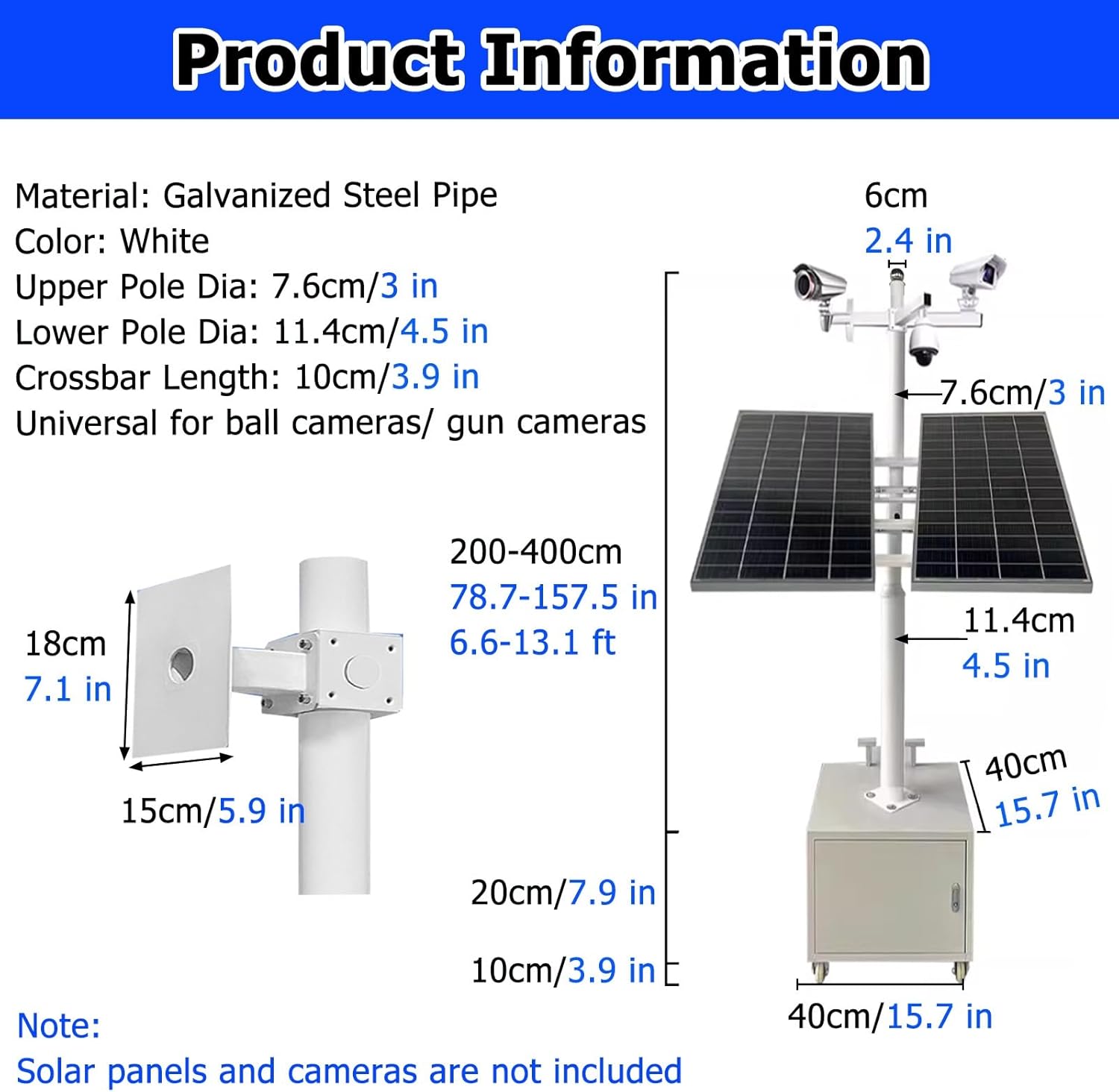 Introducing our versatile surveillance pole, designed specifically for enhancing your security setup in various environments. Crafted from durable white galvanized steel, this rust-proof pole is engineered to withstand the elements, ensuring reliable performance in both sunny and rainy conditions. Its robust construction not only enhances longevity but also maintains stability, preventing deformation over time. Mobility is a key feature of our surveillance pole, equipped with four omnidirectional wheels that allow for effortless movement in any direction. Two of the wheels have brakes, providing you with the ability to lock the pole in place, ensuring that it remains secure during operation and reducing the risk of accidental displacement. The detachable design offers significant practical benefits. When disassembled, the pole’s compact size makes it easy to transport and store, allowing you to save space when it's not in use. This feature is particularly advantageous for those who need to relocate their surveillance setup frequently, minimizing handling costs and maximizing convenience. Our surveillance pole also includes a lockable storage box at the bottom, perfect for organizing power adapters, data cables, maintenance tools, and other small accessories. This thoughtful design helps you keep your essentials neatly arranged and secure, eliminating the need for additional storage solutions. This movable pole is ideal for a variety of scenarios including temporary construction sites, parking lots, shopping malls, exhibition venues, school playgrounds, and community activity areas. It is especially beneficial for applications requiring flexibility in adjusting monitoring positions, making it a valuable addition to any security system. Best of all, installation and removal are straightforward and do not require any complicated professional tools, saving you both time and labor costs. **Specifications:** - Material: Galvanized Steel Pipe - Upper Pole Diamet...