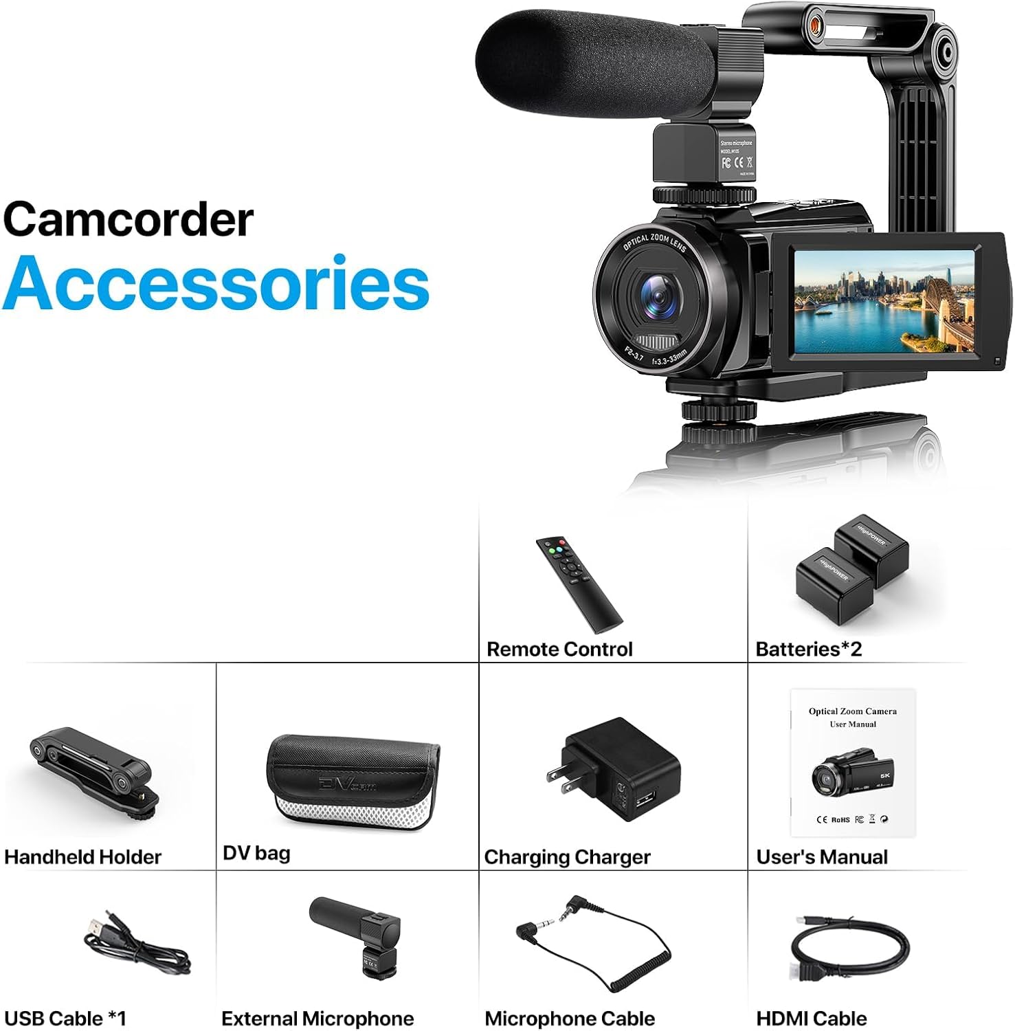 | BuiltIn Media | 1*External Microphone, 1*Handheld Stabilizer, 2*Batteries, 1*Remote Control, 1*Microphone Cable, 1*HDMI Cable, 1*USB Cable, 1*Video Camera Camcorder, 1*Camera Bag, User Manual |