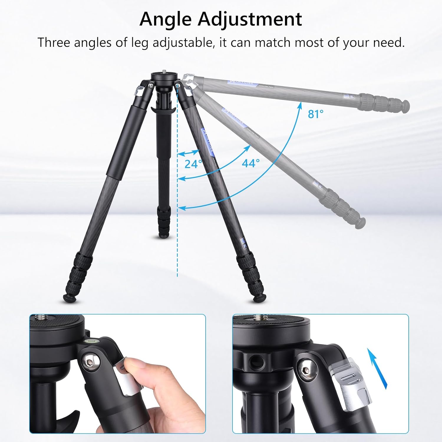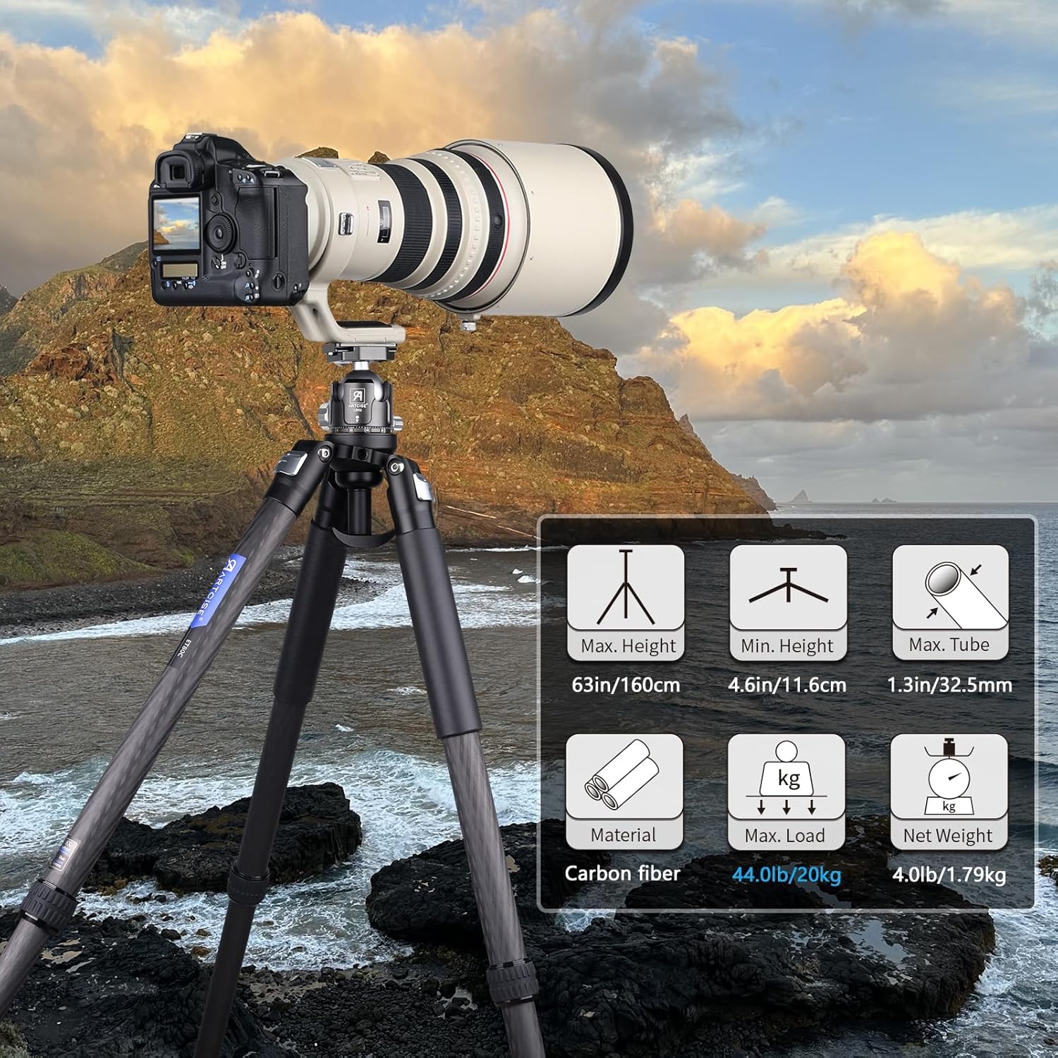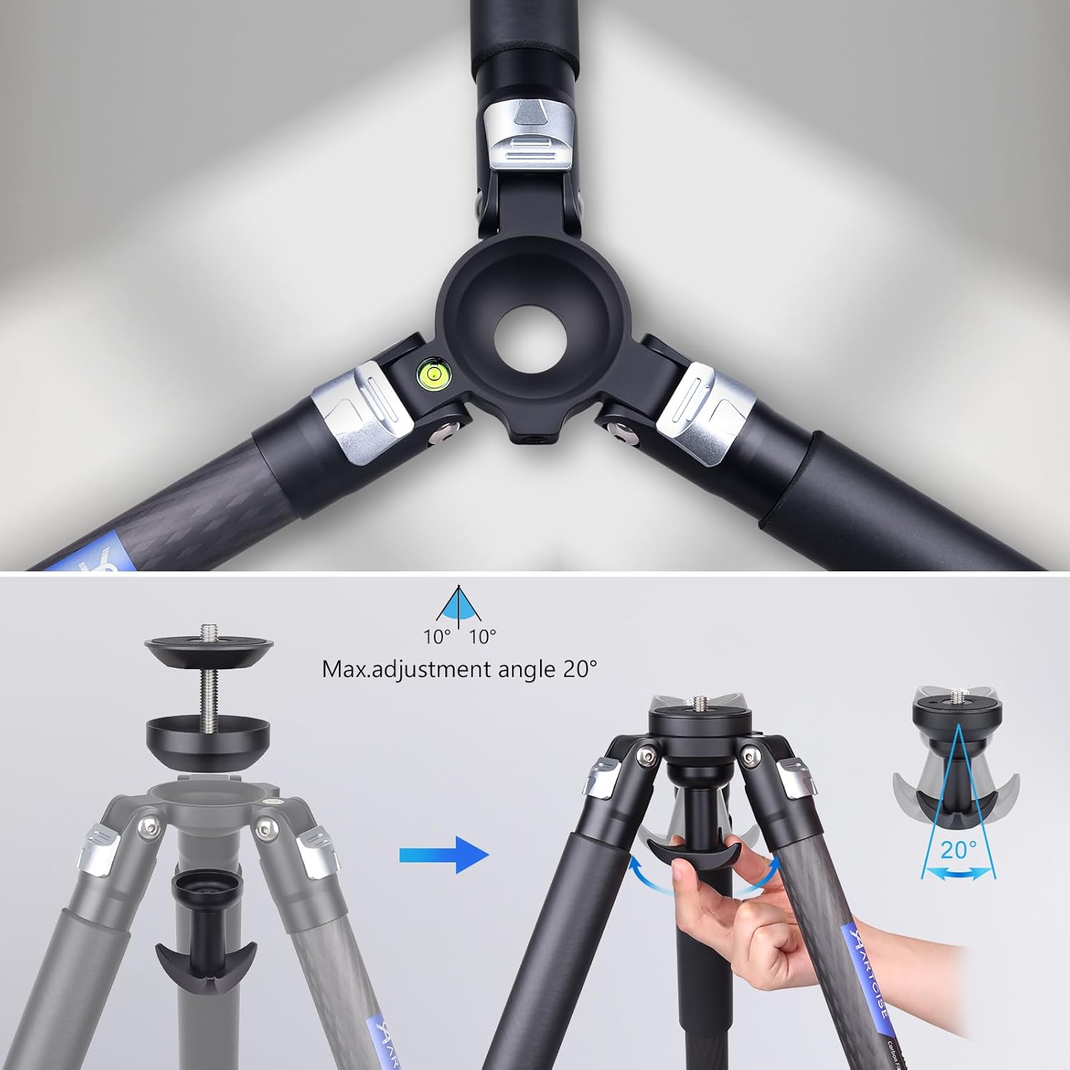 【Stable 32.5mm Tube Carbon Fiber Tripod】The high-quality carbon fiber leg tube with a large diameter of 32.5mm provides super stability but weighs only 4lb/1.79kg. The maximum load capacity is 20 kg.