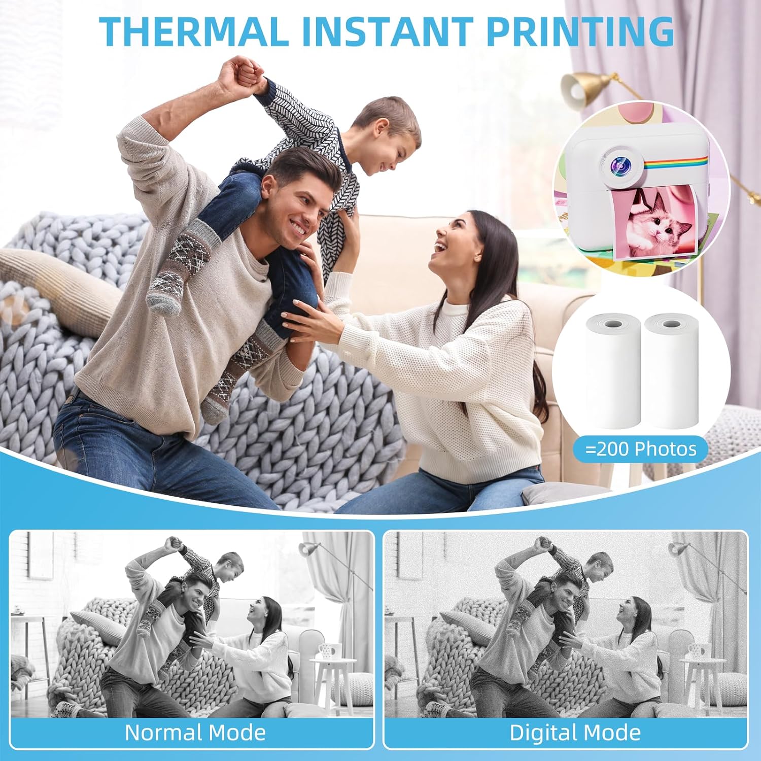 Kids Camera Instant Print,2.4 Inch Screen Kids Instant Camera,Christmas Birthday Gifts for 3-14 Year Old Girl boy,1080P HD Kids Camera Instant Print with 2 Rolls Print Paper & 32GB Card Funny Colorful Instant Printing Unlike monochrome kids’ printers, this camera uses advanced thermal tech to print photos in 2 vibrant vintage colors (red, yellow)—no ink or ribbon needed. Dual 1080P Cameras + 2.4" Screen Front and rear HD cameras with 8x digital zoom let kids capture selfies and scenery clearly, previewed instantly on the bright 2.4-inch color display. All-in-One Creative Hub for Kids Beyond photos and 1080P video, it includes built-in games, music playback, and 2 printing modes—keeping children entertained for hours. Kid-Safe & Parent-Approved Design Fully wrapped in a soft silicone protective case, made from non-toxic materials with no sharp edges—safe for ages 3–12 and durable for everyday adventures. Ready-to-Use Out of the Box Comes with a 32GB memory card and 5 x Mark colored pen, offering ample storage and long playtime. USB cable included for easy file transfer and as a power cable for the instant camera. Packing List · 1 x Color Instant Digital Camera · 1 x 32GB SD card · 1 x USB chaging cable · 1 x Hanging string · 2 rolls of printing paper(red and orange color paper), when paper run out, please contact us to order; · 5 x Multi-color paintbrush · 1 x Detailed User Manual Excellent gift for kids! It’s easy to use, prints photos instantly, and comes with all the accessories to start using it right away; This instant-printing kids' camera has been a huge success. It's perfect for kids to explore their creativity and capture their favorite moments. What they love most is being able to print their photos instantly with color paper.