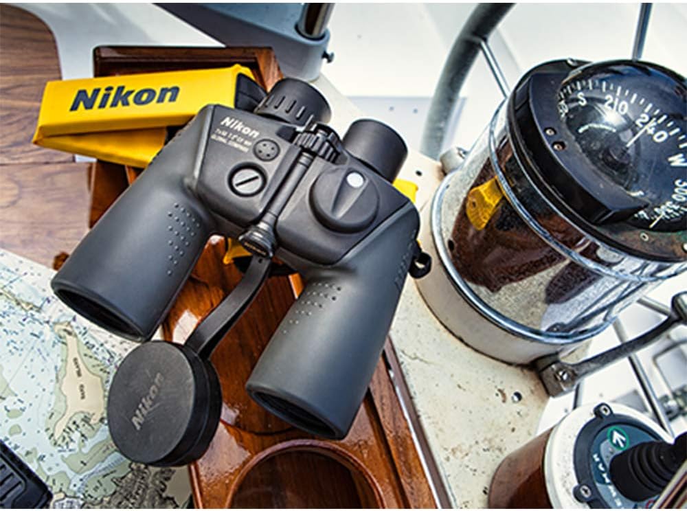 NIKON 7x50 OCEANPRO CF WP GLOBAL COMPASS MARINE BINOCULARSMarine environments place entirely different demands on optics: the ever-present moisture, the ever-present motion, and the ever-present need for your optics to perform anytime and every time. Nikon’s OceanPro binocular is engineered specifically to cope with those demands and perform with excellence in time of need.Automatic declination in Northern Hemisphere or Southern Hemisphere locations and integral scale for subject size and distance calculation.Nikon’s multicoated Eco-glass lenses bring crisp images and bright views to marine environments.Engineered to the highest standards, OceanPro is built to withstand the toughest of marine conditions.Smooth focus control and long eye relief offer fast subject acquisition and comfortable viewing with eyeglasses.Included with the OceanPro, a marine-specific floating nylon lanyard makes locating and retrieving lost binoculars easy.Tech Specs:Magnification - 7xObjective Diamer - 50mmAngular Field of View (Real) - 7.2°Angular Field of View (Apparent) - 47.5°FOV at 1000yds - 377 ftWide FOV - YesClose focus distance - 33 ft Exit Pupil - 7.1mmRelative Brightness - 50.4Eye Relief - 22.7mmSize (Lenght x Width) - (7.6) x 8 inWeight - 39.9 ozWaterproof/Fogproof - Yes Prism - Porro Navigate any waters, weather any storm