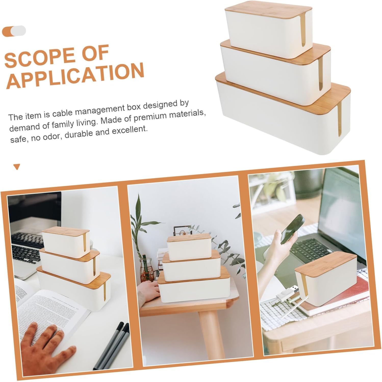 Package List 1 x Small Cable Organizer Box 1 x Medium Cable Organizer Box 1 x Extra Large Cable Organizer Box Characteristics - Material: Plastic, wood Lids Cable Management Boxes. - Size: 23.50X11.50x12.20cm/9.25X4.53X4.80inch (small) ; Cable Wire Management Box - The different size cable organizer boxes can easily meet your different requirements desk Wire Organizer Box. - This cable organizer box with multi-functional design and organized structure will keep your wires organized and protected, safe and reliable Cord Organizer Box. 40.50X15.70X13.60cm/15.92X6.17X5.34inch (extra large) Cord Organizer Box Holder. - Polished smooth and meticulous workmanship, the edges and corners are softly treated Cable Management Box Holders. 32.00X13.50X13.00cm/12.60X5.31X5.12inch (medium) ; Cable Management Organizer Box - With it, you can store your outlet apparatuses including multiple power strips, cords, adapters in convenient place Cable Management Boxes with Lids. - With cover for blocking the , keeping your cables organized and clean Cord Management Box.Goods Description Lids Cable Management Boxes This cable organizer box with multi-functional design and organized structure will keep your wires organized and protected, safe and reliable.Cable Management Boxes with Lids You can store all of your outlet apparatuses including multiple power strips, cords, adapters in convenient place