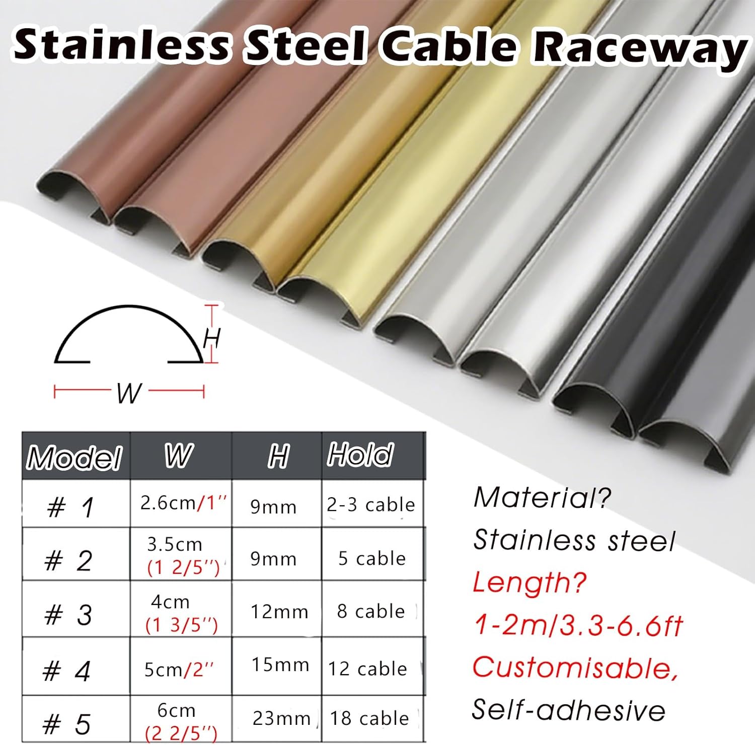 Where can use our cable organizer?Our cable management system kit can be used in offices, living rooms, bedrooms and other occasions, can hide your TV wire,power cord, telephone cable,Ethernet Cable, speaker wire, lamp cord, etc.. Keep your children and pets away from danger, and never worry about playing anytime, anywhere.Specification: 1. Material : Stainless Steel2. Color: gold 3. Cropping? Can be Cut4. Width: 2.6cm/1" , 3.5cm (1 2/5'') , 4cm (1 3/5'') , 5cm/2" , 6cm (2 2/5")5. Length: 1m/3.3ft, 1.5/4.8ft, 2m/6.5ft6. Height: 9/ 10/ 12/ 15/ 23 mm7. Can Organize 3/ 5/ 8/ 12/ 18 Wires8. Load Capacity: 100 kg/220 lbsFeatures: - Made of stainless steel, waterproof easy to clean.- They hide management wires or cables perfectly.- This cable raceway is so easy to install. - you can cut them to size if needed. (saw or pliers)- They're easy to use, adhesion is good.- Multiple colors matched with your wall/ floor perfectly. - Sticks to wall securely with back adhesive.- Surface mirror style, very stylish.Package List: - 1 x Cable RacewayTips: - There may be an error of 1-3 cm due to manual measurement.- There may be chromatic aberration due to the difference between the recording lamp and the display. Please refer to the actual product.
