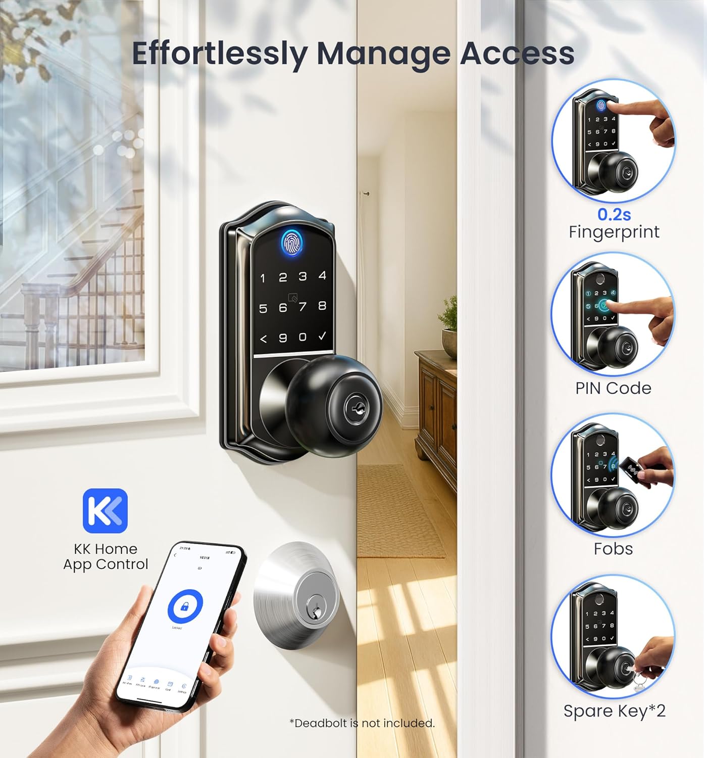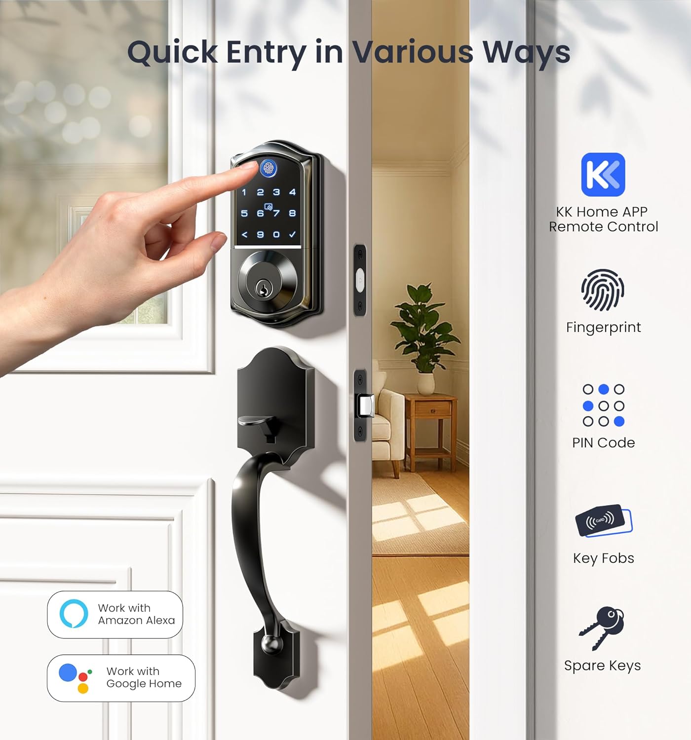 Veise Wi-Fi Smart Lock with Handle Set: Remotely Lock/Unlock & Manage Users Anywhere and Anytime; Fingerprint Keyless Entry Door Lock with Full App Control; 10 Times Wrong Code Entry Limit; 20 Fingerprints + 100 User Codes + 100 Fobs (Supported)