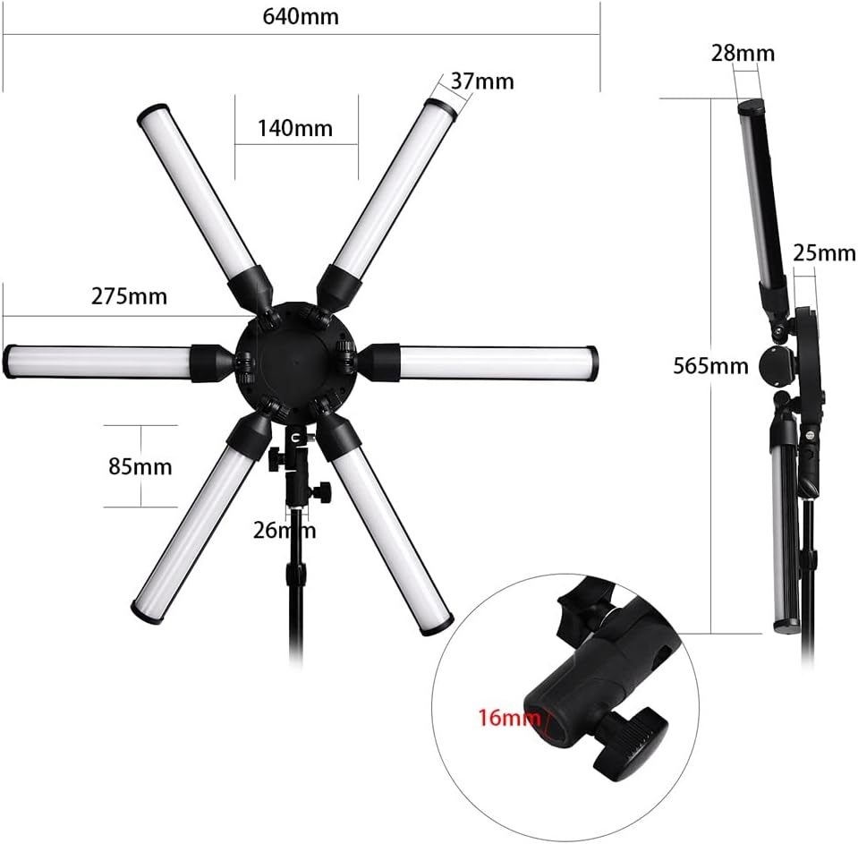 Fusitu Photography Lamp 3200-5600K Multimedia Limit 60W Led Starlight Video Lamp with Tripod for Camera Phone MakeupProduct DescriptionLed star lights are brighter than lights and are equipped with six adjustable light bars to increase light projection and range.Adjustable light bar: You can adjust any shape of the light bar at will.Equipped with 288 SMD lamp beads, the brightness is brighter than ordinary lamps.LCD: Accurate display of color temperature and brightness. port: Don't worry about your phone running out of power when you're live streaming.Uniques light: Starlight that makes your eyes shine like stars.(Note: Batteries are not included, you can purchase them from your country)standard:Light source: 2835 LED chipNumber of LEDs: 288Color temperature: 3200-5600kDimmable: YesFolding size: 140 * 140 * 310 mmFully developed size: 640 * 640 * 28 mmInput power: 100V-230V, 50Hz/60HzOutput power: 6 * 10W 60WAdapter: UniversalLamp holder:Folding height: 325mmMinimum height: 330mmMaximum height: 1230mmPacking list:1 * Storage bag1 * 6 tube LED lamp1 * Lamp holder1 * User Manual1 * Ball joint1 * Power cord1 * Power adapter1 * ConnectorNotes:1 Please allow an error of 2-3% due to manual measurement. Please make sure that you don't mind it.2. The color may vary due to the display, please refer to the physical object.Due to manual measurement, please allow for a difference of 1-3 centimeters. Thank you for your understanding