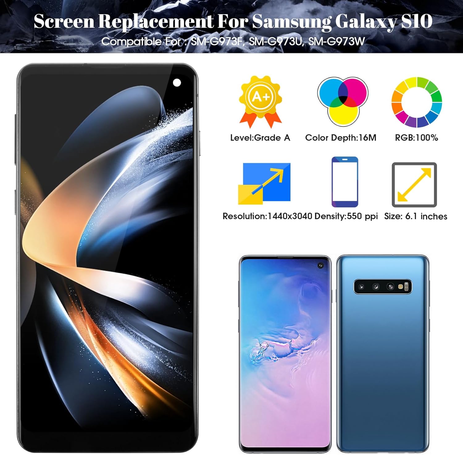 Our Screen Is High Quality LCD Display Touch Screen Digitizer Assembly Replacement with Frame For Samsung S10Product Description:-Metarial: TFT-Model: SM-G973F, SM-G973U, SM-G973W, SM-G973U1, SM-G9730, SM-G973N, SM-G973X, SCV41, SM-G973C-Size: 6.1 inches-Resolution: 1440 x 3040 pixels-Suitable For: For Samsung S10 LCD Display Touch Screen Digitizer Assembly Replacement with Frame-Package Including:1x LCD Touch Screen Assembly Replacement with Frame1x Free Double-sides Adhesive Tape1x a set of install toolsInstallation Precautions:1. Check whether the product is in good condition and test it before installation. Do not remove protective film or labels during testing. Watch out for static issues.2. The screen is glass, which is a very fragile product. Testing before installation is strongly recommended3. Do not bend the cable. During installation and testing, make sure the LCD cable is not bent. Curvatures greater than 90 degrees will result in a black view.4. If your phone has a black screen during installation, press and hold the power key and volume key at the same time. If the phone vibrates, it's because the mainline is not installed properly. Then reinstall the product.5. If you are not professional in maintenance, or have no experience in repairing electronic equipment, we do not recommend you to replace the screen by yourself. Take it to a repair shop for help to save you time and money. Or find the relevant installation video on the YouTube platform and follow the installation steps to install.