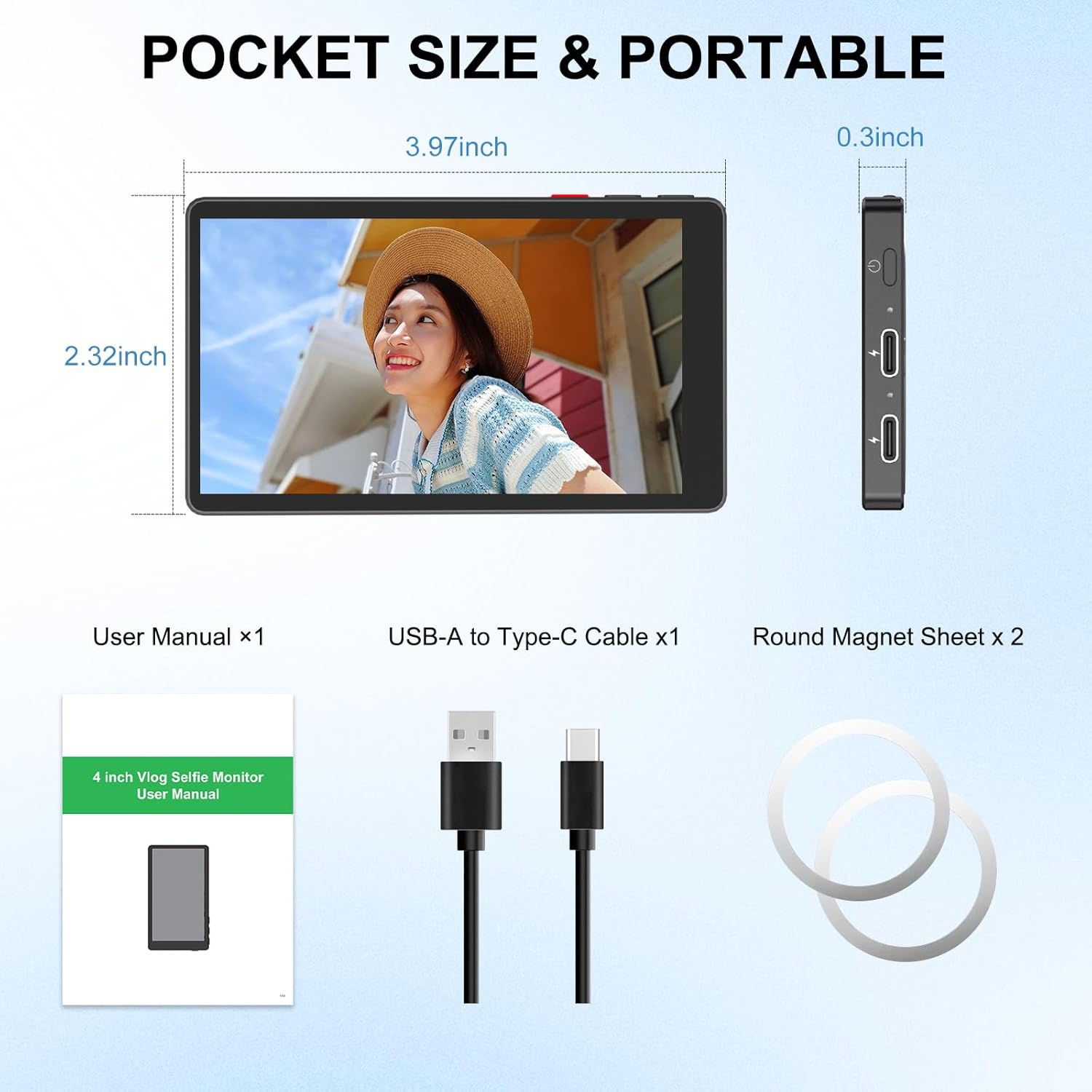 | BuiltIn Media | 1×4" selfie monitor screen, 1×USB-A to USB-C cable, 2× round magnet sheet, User Manual |