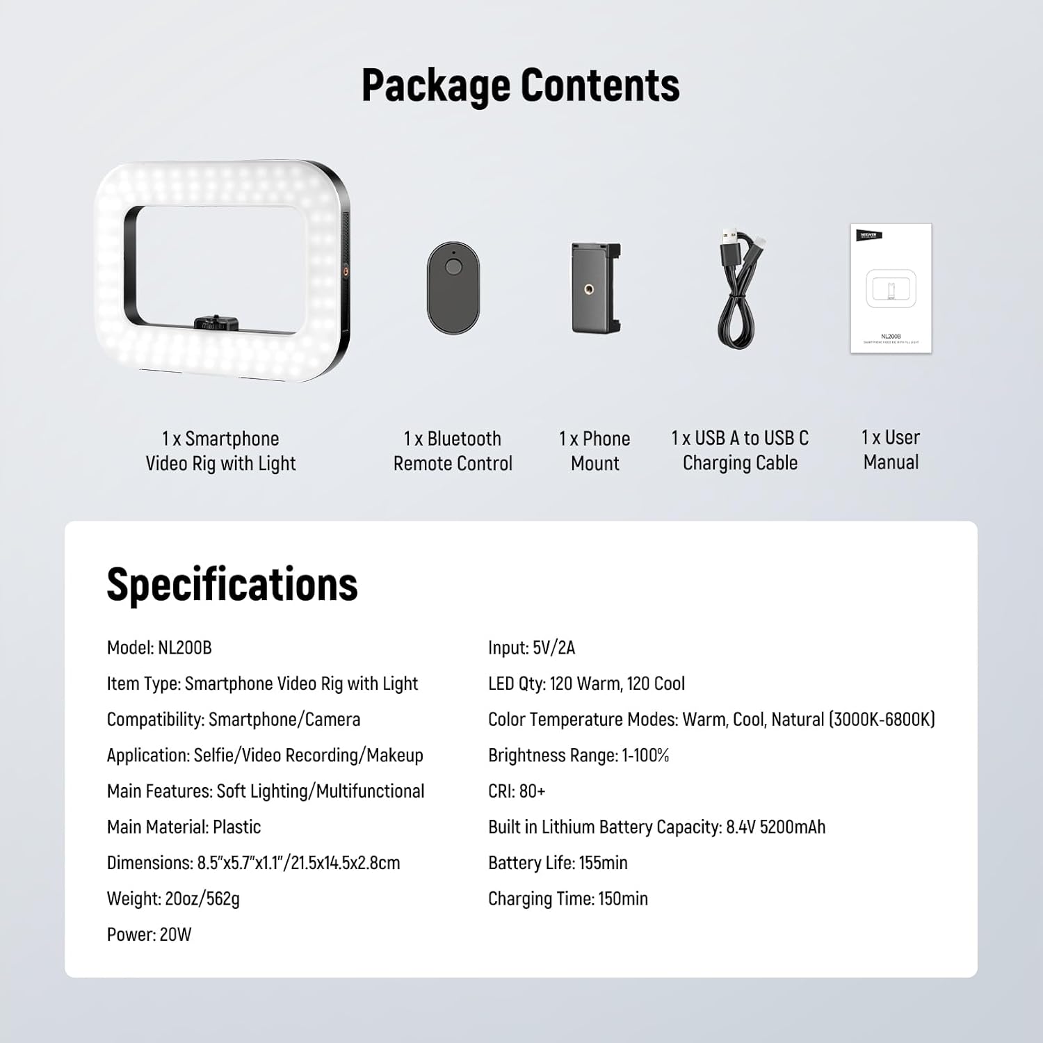 | BuiltIn Media | 1 x Smartphone Video Rig with Light 1 x Phone Mount 1 x USB A to USB C Charging Cable 1 x User Manual |