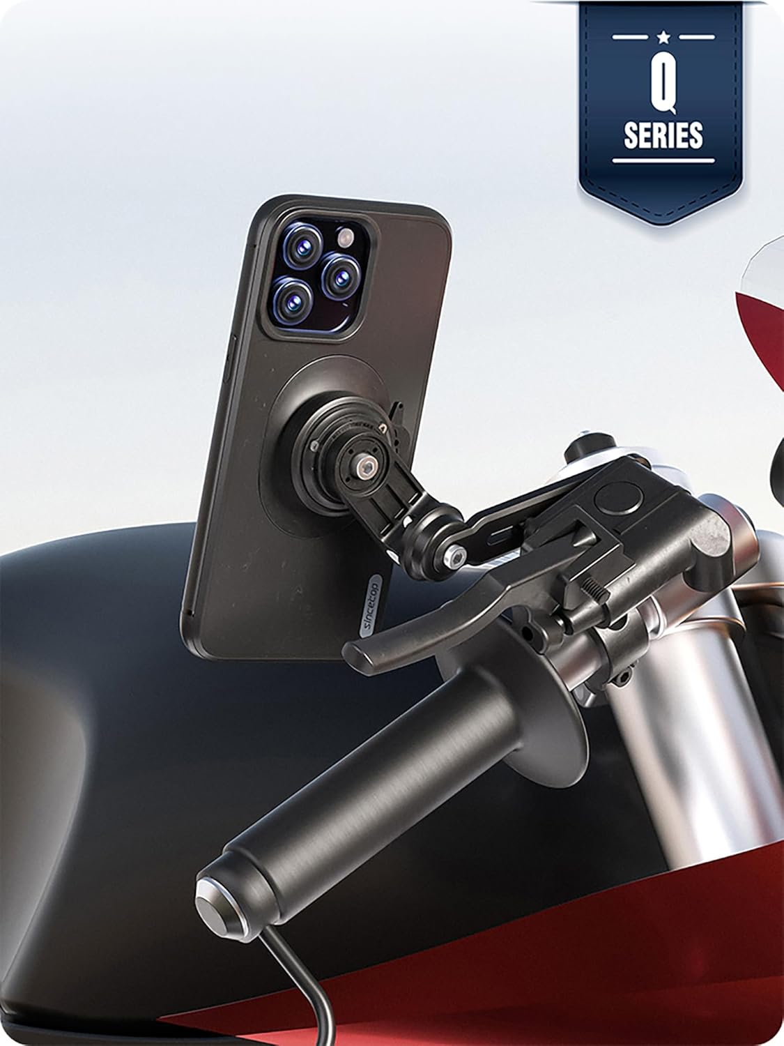 Select the Sincetop New Q Series for an unprecedented riding experience.Product features:【One-Handed Operation】:With just one touch, the alloy buckle in the mount will automatically buckle, firmly fixing the adapter (mobile phone) on the mount.【Quick Release】:Just turn the phone clockwise 80 degrees, and the alloy buckle will automatically release the buckle on the adapter, at which point you can easily remove your phone.【Super Security】:The mount base is made of aviation aluminum alloy, providing excellent stability and durability.The safety lock lever can limit the rotation of the phone, providing secondary locking.The mounts are equipped with mobile phone sling, which can be used with mounts to increase safety. Multiple safety guarantees allow you to enjoy a safe riding experience.【Modular Design】:Q series products adopt professional modular design, providing unlimited possibilities for customization or personalized modification. You can purchase various accessories such as Vibration Dampener modules, Wireless modules, Magnetic modules, etc. for upgrade.Package includes:Mount * 1 + Adapter * 1User Manual * 1Screw M4*16mm * 2Screw M4*20mm * 2Spacer * 2Screwdriver 3.0mm * 1Screwdriver 4.0mm * 1Silicone Adapter * 1