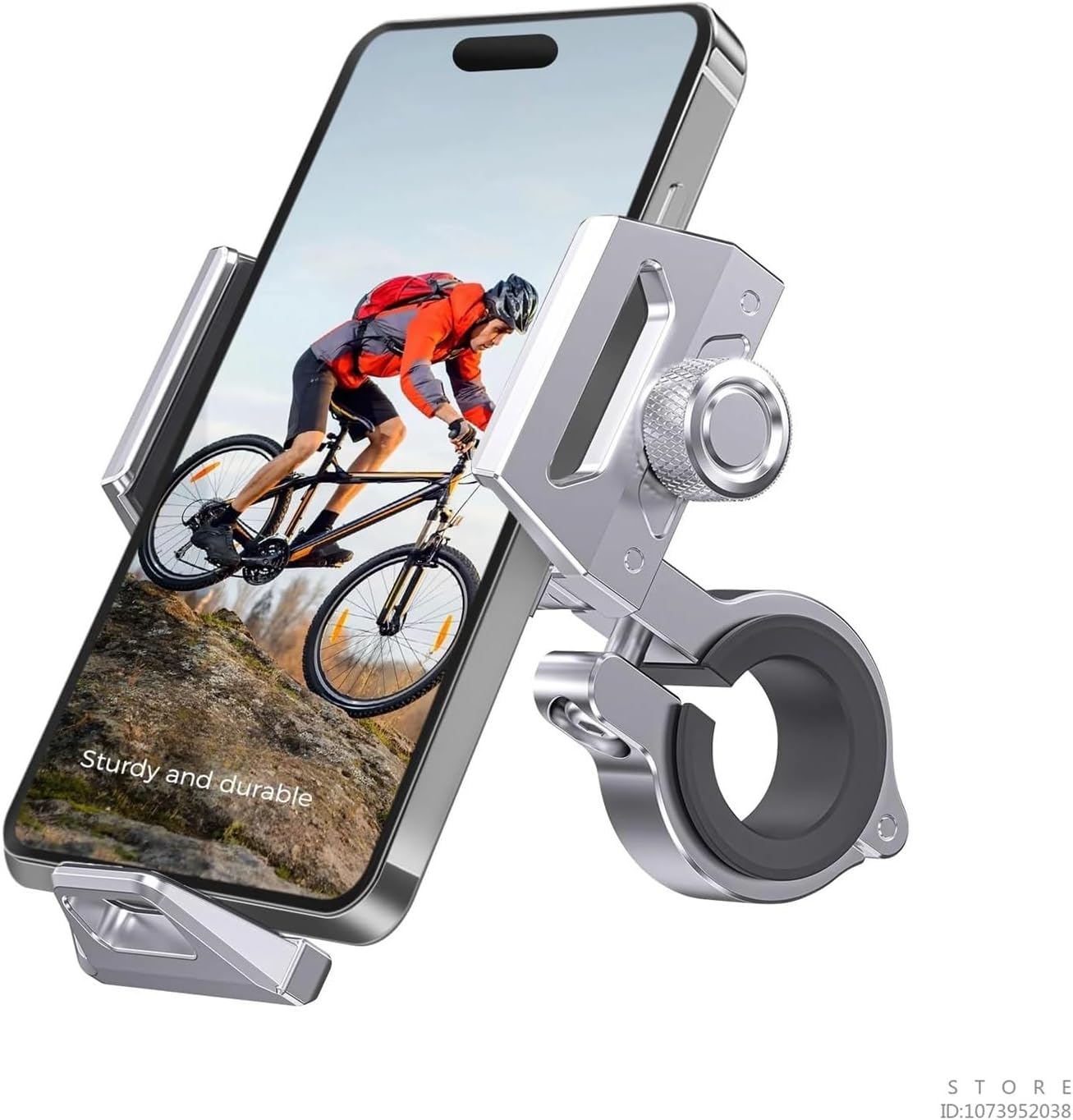 Bike Motorcycle Mount Holder, 360° Rotatable Holder Motorcycle Handlebar, Aluminum Stable Bike Holder 4.7-7.9'' Fit for iphone Fit For Samsung fit for galaxy SmartphonesStable , Shake and No Wobble Aluminum mount motorcycle and bike, sturdy and durable. There is an adjustable screw on the clip, which can hold your securely. And the all-around rubber pads on clip also your from scratching and slipping. The holder motorcycle bike is also equipped with an silicone pad, which can tightly secure the mount to the handlebar, ensuring even when the road is bumpy, steep, or muddy.360° Adjustable Bike and Motorcycle Cell Holder This flexible motorcycle mount can rotate 360 degrees and adjust the angle with hand operation. While driving, you can adjust the angle of the holder as needed, and can easily switch the screen between horizontal and vertical viewing angles, making your viewing more comfortable without worrying about the angle change.Easy to Install and Use This bike and motorcycle cell mount is very easy to install without any extra tools. You just need to choose the silicone according to the size of your handlebar, place the handlebar clamp and silicone on the handlebar, and then tighten the screws to fix the metal motorcycle mount firmly on the handlebar. Then you can fix your mobile on it.Wide Compatibility This universal bicycle and motorcycle handlebar mount can all 2.7-4.1" wide phones, such as Fit for iphone Fit For Samsung and more. The max thickness the clip can hold is 0.43". We provide two silicone rings with different diameters handlebars from 0.86''(22mm) to 1.06'' (27mm) in diameter, which makes it suitable motorcycles, bicycles, electric scooters, and scooters.Package Package includes: 1PC Mount bike and motorcycle, 2PCS Silicone , 1PC Hex Key.