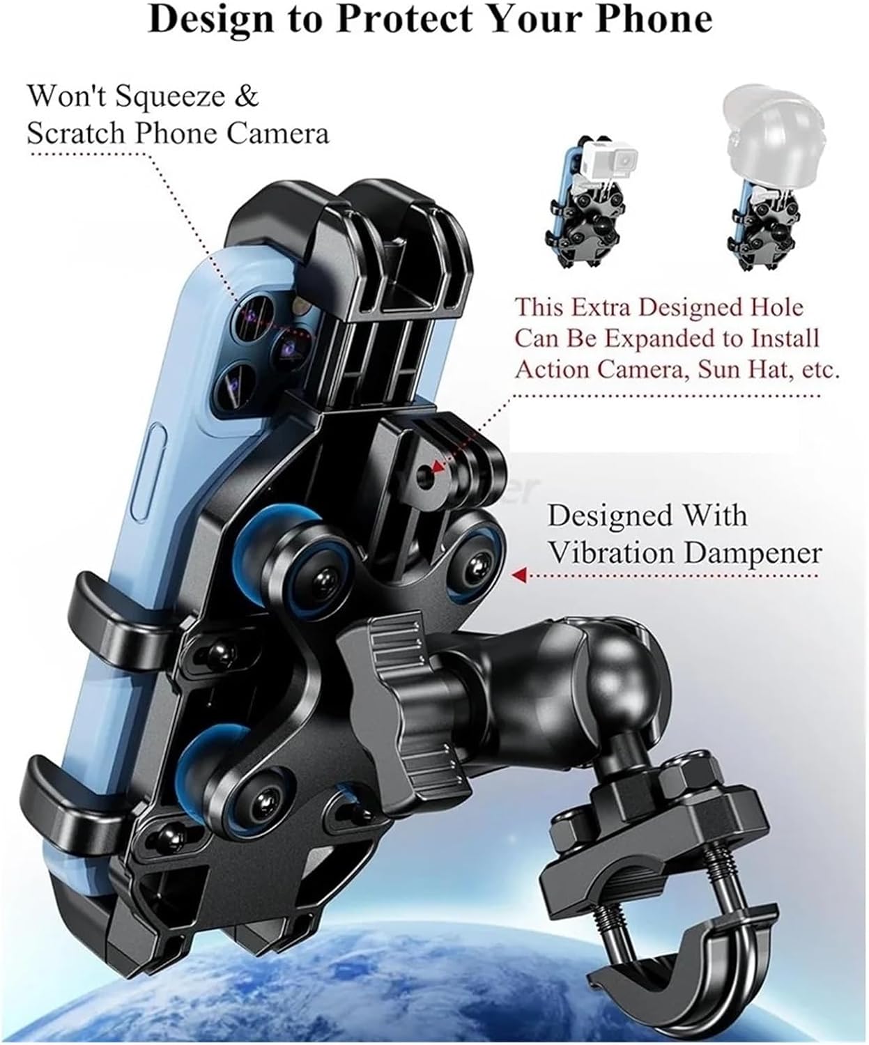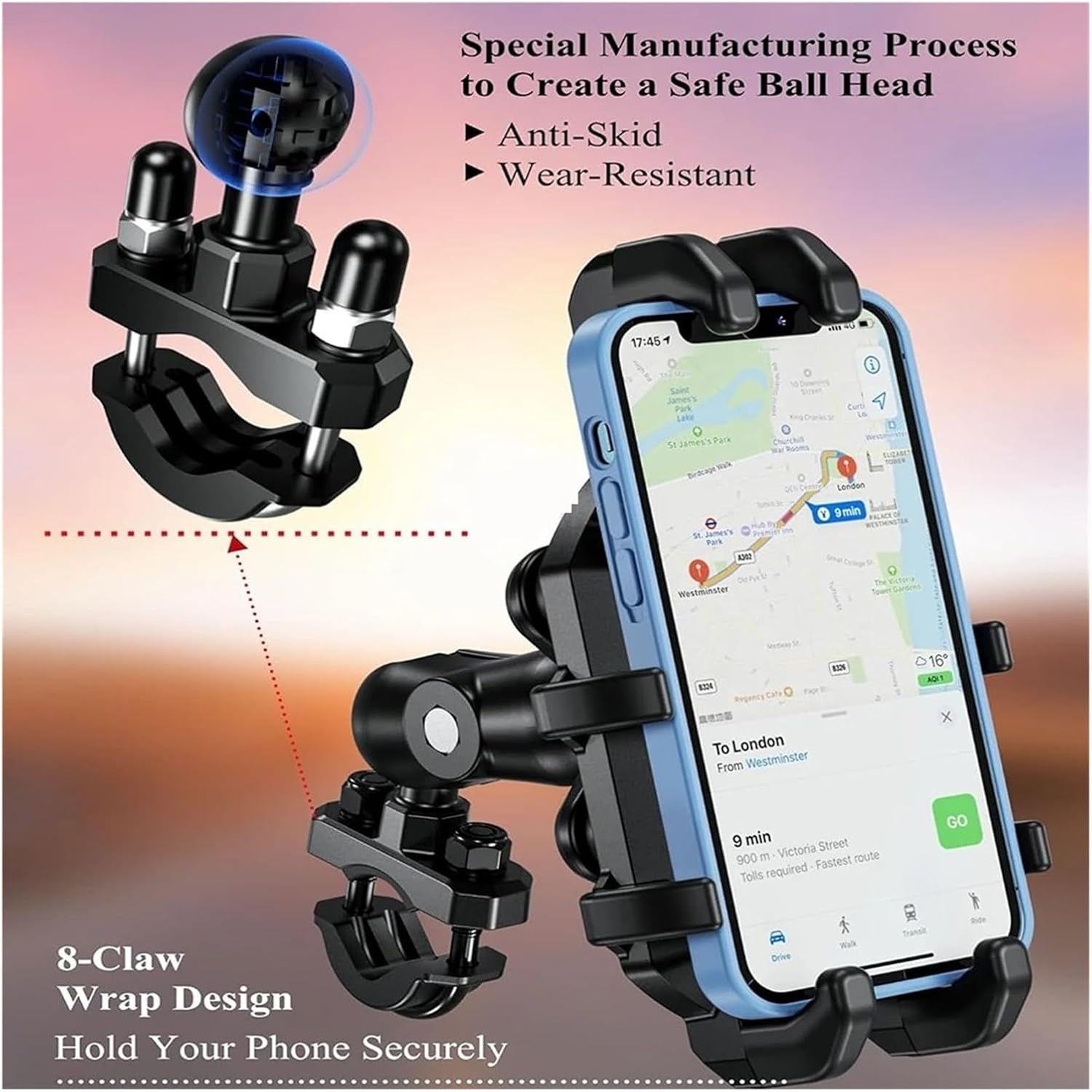 "DescriptionReport ItemFeatures:Sturdy and Safe: The main body of this motorcycle phone holder is made of high-strength composite materials, providing durability and reliability in the most demanding environments. Built-in industrial springs and a special eight-claw wrapping phone design ensure that your phone is securely fixed on the phone holder even when driving on bumpy roads.Adjustable Design, Wide Compatibility: Adjustable width design can accommodate mobile phones of more sizes. This Bike Phone Mount Holds Phones (Case Included) Dimensions: Maximum Width: 88mm(3.46''), Maximum Length: 178mm(7''), Maximum Thickness: 16mm(0.629''). Compatible with cellphone screen diagonal size: 5.4-7.2 inchesPLEASE NOTE:Can accommodate mobile phones with a maximum width of 88mm, a maximum length of 178mm, and a maximum thickness of 16mmWhen mounting for the first time, you only need to insert your cell phone, turn the switch and adjust the holder to the correct width. By turning the switch on and off, the cell phone can be attached or removed in 1s. You can capture the beautiful moments of your trip at any time."