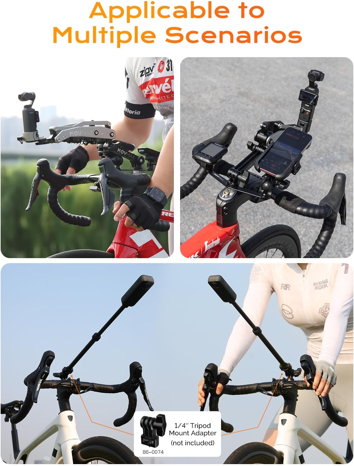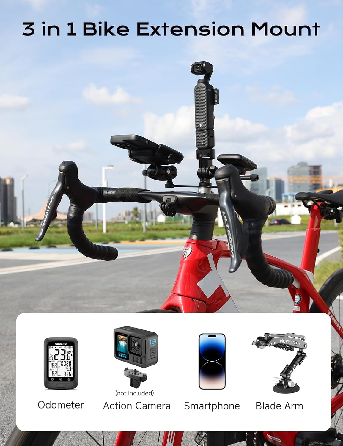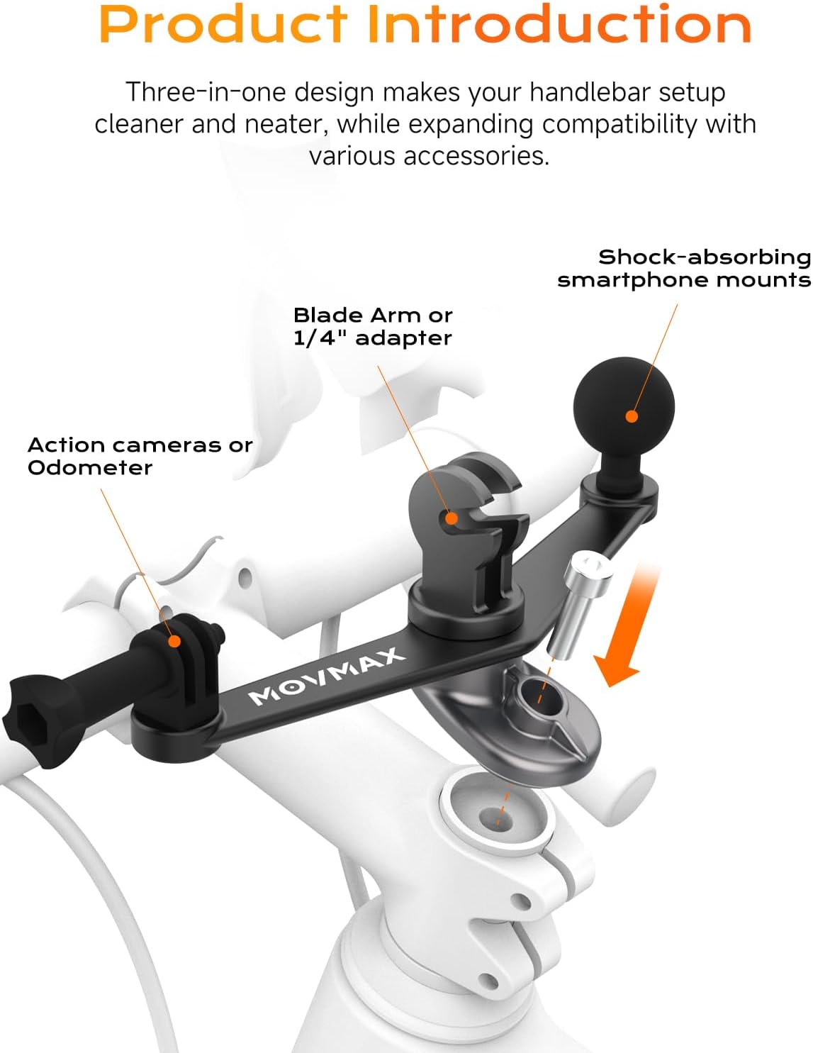 【3 in 1 Extension Mount 】Three-in-one design makes your handlebar setupcleaner and neater,while expanding compatibility with various accessories. 【Widely Compatible】 The left side can be directly paired with a speedometer/bicycle speedometer/action camera (excluding the action camera adapter), the middle side can be paired with Blade Arm, and the right side provides a standard one-inch ball head that can be connected to a mobile phone stand accessory 【No More messy】The product is made of all-aluminum alloy, with a silky touch. Visually, it blends seamlessly with the bicycle and looks more aesthetically pleasing than regular bicycle accessories 【Effortless group shooting】Easily capture footage of your riding partners along the way become the photographer your cycling team