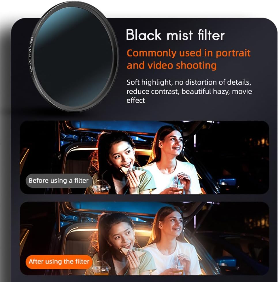 Features: 【Phone Lens Filter Kit】This 67mm filter kit includes a CPL filter, a astral filter, a black mist filter, a magnetic adapter ring, and a good-grade phone case to protect your phone. 【Magnetic Lens Adapter Ring】Experience the convenience of the magnetic lens filter kit with its easy-to-use magnetic lens adapter. 【Astral Filter】Capture the enchanting glow of streetlights, sunlight, shimmering water, and jewelry. Achieve stunning effects that make your photos stand out. 【Black Mist Filter】Enhance your portrait and video shots with this lens filter kit. Soften highlights, preserve intricate details, and reduce contrast for a dreamy and ethereal aesthetic. Achieve a cinematic effect that adds a touch of elegance to your visuals. 【CPL Filter】Take your landscape photography to the next level with this lens filter kit. Rotate the filter to eliminate unwanted glare and reflections from non-metallic surfaces. Specifications: Color: Black Material: Optical glass + Aluminum alloy + PC Interface: 67mm thread Packing List: 1 * Phone Case 1 * Cleaning Cloth 1 * 67mm Adapter Ring 1 * 67mm Black Mist Filter 1 * 67mm CPL Filter 1 * 67mm Astral Filter 1 * Filter Storage Case