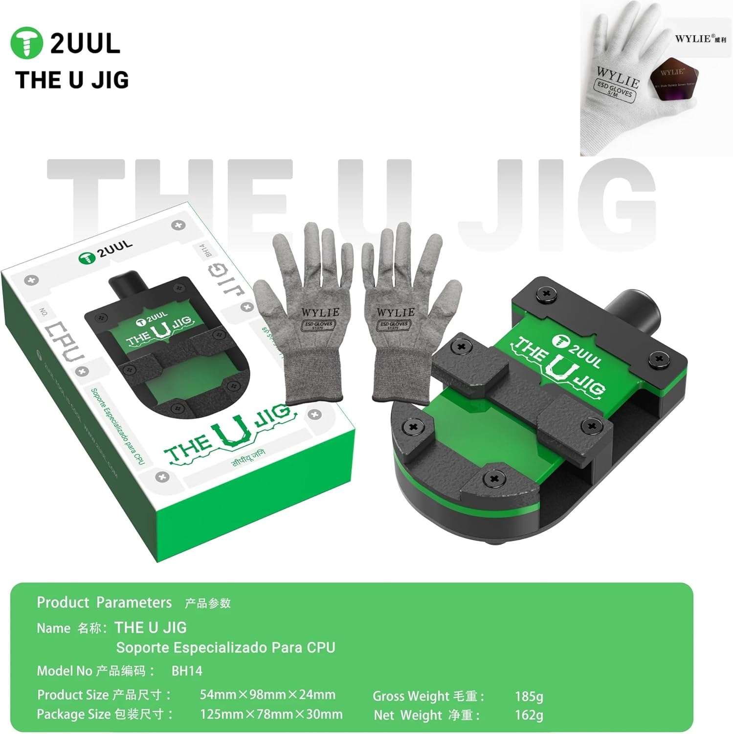 2UUL BH14 The U JIG CPU Soldering Fixture Heat Resistant Clamp for Phone Motherboard PCB Repair Upper CPU Lower Mobo Tool WYLIE Professional Soldering Tools 12 Pack➤Product Description:🍀 ✔✿ - The 2UUL BH14 U JIG is a professional-grade CPU soldering fixture designed for precision phone motherboard and PCB repair work;🍀 ✔✿ - This comprehensive 12-piece toolkit includes the specialized U-shaped clamp that securely holds upper CPU and lower motherboard components in perfect alignment during delicate soldering operations;🍀 ✔✿ - Engineered with heat-resistant materials that withstand temperatures up to 392°F, this fixture maintains its structural integrity during high-temperature repair procedures;🍀 ✔✿ - The robust construction features adjustable screws for stable clamping, ensuring components remain stationary throughout the repair process. This complete repair kit includes essential accessories such as the K1 blade screen opener, ESD protective gloves, ultra-fine 0.02mm fly line, cleaning cards, and other professional tools needed for thorough electronics repair;🍀 ✔✿ - The compact design weighs just 12 ounces, making it portable yet durable enough for professional technician use. Whether you're working on CPU replacements, motherboard repairs, or intricate PCB soldering tasks, this fixture provides the precision and stability required for successful repairs.📦➤Package Contents:✿- 1x Pack of 2UUL BH14 The U JIG CPU Soldering Fixture Heat Resistant Clamp for Phone Motherboard PCB Repair Upper CPU Lower Mobo Tool;✿- 1x PCS of WYLIE name card PVC fine frosted plastic material removing screen functional card;✿- 1x PCS of WYLIE WL-5A Solder paste scraper dismantling machine piece non destructive tin scraping slice;✿- 1x Pair of WYLIE ESD BGA repaire soldering working antiskid new environmental protection carbon fiber gloves;✿- 1x Pack of WYLIE 5PCS High temperature resistance thermal pads screen insulation sheet for iPhone 11-17 Pro Max Plus;✿- 1x PCS of WYLIE Dot repairing solder lug for mobile phone welding flywire replacement spot soldering jumper wire repair pad;✿- 1x PCS of WYLIE WL-002 Superfine silver jump wire 0.02MM copper wire ultra fine fly line for iPhone fingerprint mainboard chip repair;✿- 3x PCS of WYLIE WL-9A Dismantling Blade for iPhone iPad Domestically Produced Curved Mobile Phone LCD Screen Dismantling Tool;✿- 1x Pack of WYLIE WL-891 0.3mm Protective LCD Thermal Insulation Pad 10PCS for Mobile Phone Repair Screen Protection IC Transplantation Tool;✿- 1x PCS of WYLIE K1 blade durable screen opener with 5 different depth corners tear down and flake opening pry tool for iPhone for Android Huawei Oppo iPad Macbook screen tool.