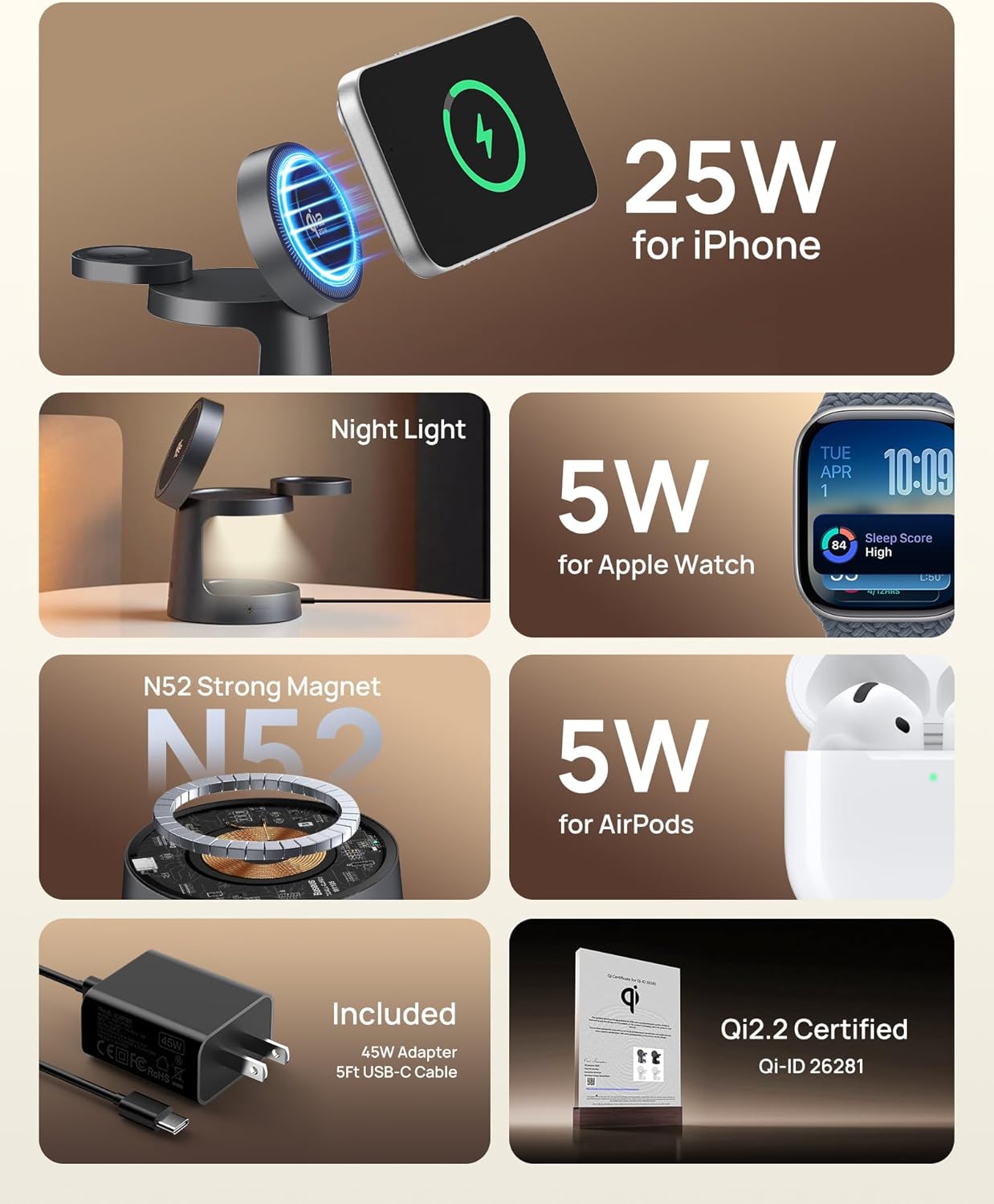 | Additional Features | 45W Adapter & 5Ft USB-C to C Cable Included, 5W Apple Watch Charging, Built-in Warm Yellow Night Light (Dual Brightness), Compact Portable 3-in-1 Wireless Charger, Qi2.2 Certified & 25W Wireless Fast Charging |